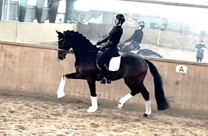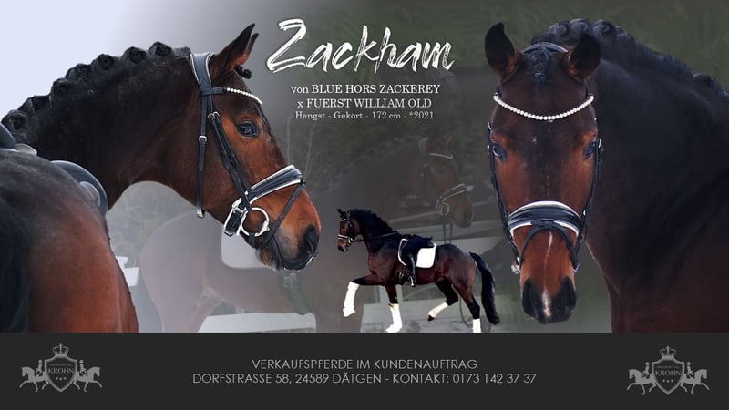 SYMPATHISCHER BEWEGUNGSKÜNSTLER - VIEL QUALITÄT UND TRAUMHAFTER CHARAKTER - GEKÖRT & LEISTUNGSGEPRÜFT - MEHRFACH PLATZIERT IN REITPFERDE UND DRPF A MIT EINZELNOTEN BIS 9,0 - GEZOGEN AUS ZG WERTH - MIT VIEL PERSPEKTIVE FÜRS DAS GANZ GROSSE VIERECK - Junioren geeignet! Zum Verkauf steht in Vertretung des Besitzers, dieser 172cm großer, dunkelbraune, 5-jährige, gekörte & Leistungsgeprüfte (Hannover, Oldenburg, Mecklenburg) hannoveraner Bewegungskünstler. Er stammt ab von BLUE HORS ZACKERY x FÜRST WILLIAM OLD und sein Pedigree lässt großes für die Zukunft erhoffen. Er steht im Deckeinsatz, kann aber auch vom Käufer gelegt werden. "ZACKHAM" weiß auf den ersten Blick zu beeindrucken. Mit harmonischer Gebäudeaufteilung, moderner Hochbeinigkeit im modernen Sportpferdetyp, wunderschönem Gesicht und seinem sympathischen Charakter, zieht er gleich alle Blicke auf sich. Setzt sich "ZACKHAM" in Bewegung, wird klar, hier zeigt sich außergewöhnliches Bewegungspotential gepaart mit einer Winkelung die jetzt schon den Grand Prix Sportler in Ihm erkennen lässt. Elastizität, Schulterfreiheit, Schub, Mechanik, Hinterhand, Abdruck, Bergauftendenz & Tragkraft. Das alles entwickelt er aus einem sehr gut gewinkelten, aktiven Hinterbein, das die Bewegung über den schwingenden Rücken, bei gutem Raumgriff, ins Bergauf, überträgt, bei herrlich freier Schulter. "ZACKHAM" befindet sich seid dem Einreiten in professionellem Beritt und ist auf Dressurpferde L Niveau und im Training werden bereits M Lektionen erarbeitet (Fliegende Wechsel, Traversalen). Dabei zeigt er viel Talent auch in der spielerischen Arbeit mit halben tritten. Seine Erfolgsbilanz kann sich sehen lassen. Er ist nicht nur gekört, sondern bereits ehrfach in Reitpferde und Dressupfede A Prüfungen platziert und Leistungsgeprüft. (Kurz VA Test). Es liegt ein aktueller, guter klinischer und röntgenologischer (Standard + Hals + Rücken) Tüv vor. "ZACKHAM" könnte nach dem Kauf auch SEHR GERNE bei uns in professionellem Beritt zur weiteren Förderung und Turniervorstellung, auch International FEI, verbleiben.