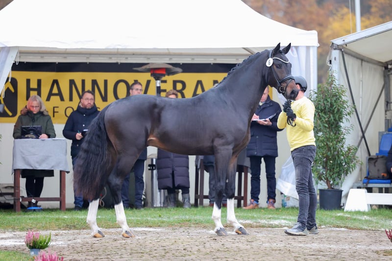 Mit Fontainebleau l‘ami freuen wir uns, Ihnen eine ganz besondere züchterische Offerte präsentieren zu können. Dieser hochmodern aufgemachte For Romance I x Christ Nachkomme aus der Zucht von Thomas Ehrengut, besticht neben seiner bedeutenden Qualität auch durch seine hohe Leistungsbereitschaft und sein exquisites Interieur – zuchtunerlässliche Attribute, die der junge Nachwuchsvererber bereits bei seiner Körung in Verden (2024) beeindruckend zur Schau stellte. Dort begeisterte er sowohl das Fachpublikum als auch die Körkommision. Ausgestattet mit einer überragenden Übersetzung, maximaler Elastizität und einer optimalen Schwungentfaltung, präsentierte sich der elegante Hengst während der gesamten Körveranstaltung auf beeindruckende Weise und wurde verdientermaßen mit dem Prädikat „Prämienhengst“ gekört. Ein Ausnahmehengst, von dem wir sowohl in sportlicher als auch in züchterischer Hinsicht noch viel erwarten dürfen. Fontainebleau l‘amis überaus beeindruckendes Pedigree vereint sowohl väterlicherseits über For Romance - Sir Donnerhall I als auch mütterlicherseits über Christ - De Niro eine wirklich hochinteressante Dressurgenetik. ZULASSUNG: Hannoveraner Verband Sein Vater For Romance I entstammt der erfolgsverwöhnten Mutterlinie des Voltaire, jenes Furioso II-Sohnes, der züchterisch und sportlich weltweite Bedeutung erlangte. Unter Therese Nilshagen/SWE sammelte er hohe Platzierungen in Grand Prix. Für seine überragenden Erfolge erhielt der Siegerhengst und Burg-Pokal- Finalist die Auszeichnung VTV-Dressurhengst des Jahres 2019. Mit Mutter-Vater Christ trägt Fontainebleau l‘ami einen weiteren Grand Prix-Pferdemacher in sich. Seine Nachkommen sorgen sowohl im Sport als auch auf Auktionen immer wieder für F u r o r e . Er selbst war im Dressurviereck bis zur schweren Klasse erfolgreich. Gezogen über Competent, einem Enkel des Calypso II, Springspitze Picard und den Vollblüter Daimo xx, liefert Christ genau die genetische Vielfalt, wie sie in der modernen Pferdezucht gefragt ist.Fontainbleau l‘amis Mutter Calimera ist eine Vollschwester des Grand Prix-erfolgreichen Hengstes Cadeau Noir, der sich 2024 unter Moritz Treffi nger Team-Gold bei der U25-EM in Österreich sichern konnte. Mütterlicherseits trägt er über Großvater De Niro exquisitestes Dressurblut in sich. Er ist der weltweit erfolgreichste Dressurvererber überhaupt und seine Erfolgsbilanz bricht alle Rekorde. Die Gewinnsumme seiner Nachkommen beläuft sich auf über 3,4 Millionen EURO.