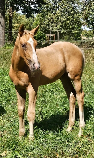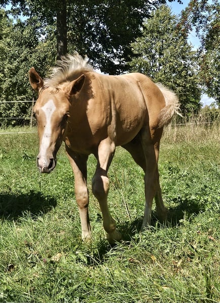 Poulain hongre hanovrien de couleur magnifique fuchsisabell (palomino) V.Qandide (Quasi Gold x Florescount) x Hochfein x Rubin Royal Son fondement correct, sa qualité de mouvement ainsi que son excellent caractère en font un jeune cheval prometteur – avec un potentiel pour une carrière sportive réussie et beaucoup de plaisir ! En cas d'intérêt, la mère est également à vendre.