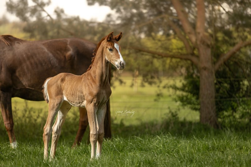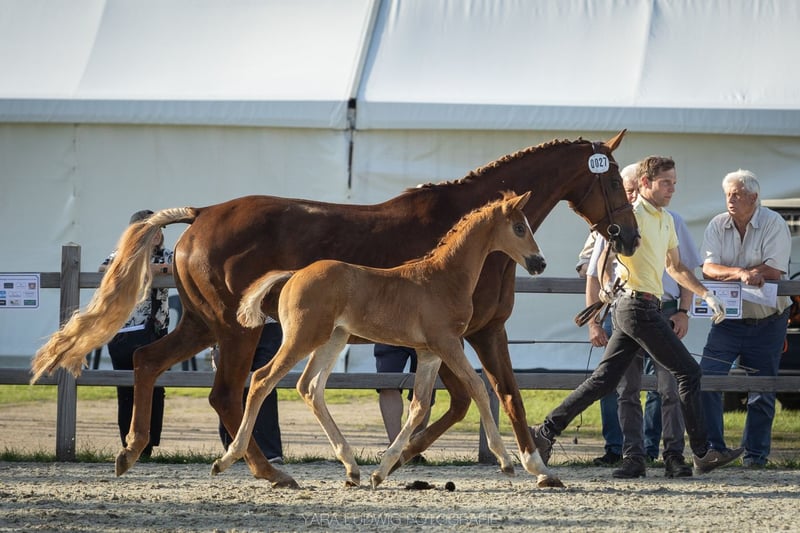 Sky-Dweller is a charming colt, born on April 26, 2025, who captivates with his charm and potential. In the photos, he is just 5 days old. He presents himself in a beautiful chestnut color that will develop into an elegant dark chestnut over time. Particularly striking is the lovely blaze that gives him a unique appearance. At the foal show in Luhmühlen, this young talent was rated 8.5 for type and 7.5 for the rest. He handled all challenges with confidence, is well-behaved on the trailer, and is extremely sweet, cuddly, and friendly – just like his mother. The setting, the audience, and even the waiting on the trailer were no problem for the foal at all. The foal is growing up with his mother in a harmonious herd of five mares with offspring, providing him with a natural and social environment. About the dam line: Fajana is a dark chestnut mare born in 2011, by Fürst Nymphenburg × Liseth (by Londonderry). She is a state premium mare bred by Hans-Henning von der Decken. In 2014, she completed her performance test. Her very good basic gaits are lively and expressive. Riding score by judge: 8.0 Riding score by external rider: 9.5 She has won dressage tests at the A level. Height: 168 cm In the pictures, the colt is 5 days old. One photo is from the foal show on June 13, 2025, in Luhmühlen.