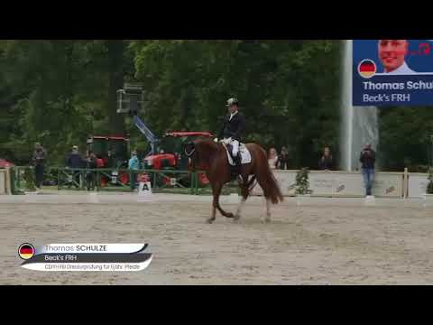 Beck´s FRH von Benicio – Desperados zugelassen für Hannover, Oldenburg und Westfalen WFFS frei Röntgenprotokoll unter www.hof-thelker.de Decktaxe: 300 € bei Besamung + 800 € bei Trächtigkeit am 45. Tag (zzgl. USt.) Jungzüchterrabatt! Züchtern bis 25 Jahre gewähren wir 40% Rabatt! Weitere Informationen bei Christian Thelker +49 175-854 3529 „Ein Hengst mit bedeutendem Auftritt im Trabe und sehr schönem Überguss“ war der Kommentar des hannoverschen Zuchtleiters, Ulrich Hahne, auf der Körung in Verden. Diesen Eindruck konnte Beck’s FRH jährlich bestätigen! Mit seinen drei deutlich überdurchschnittlichen Grundgangarten, einem korrekten Fundament mit sehr guten Hufen, einem herrlichen Seitenbild und einer sehr positiven Arbeitseinstellung bei vorbildlichem Charakter, wusste er von Beginn an zu begeistern. Nach erfolgreicher Hengstleistungsprüfung startete Beck’s FRH unter dem Sattel von Thomas Schulze sportlich durch. Neben Siegen in Reit- und Dressurpferdeprüfungen platzierte sich Beck’s FRH 2022 im Hannoveraner Championat und vertrat die Hannoveraner Farben beim Bundeschampionat der 4-jährigen Hengste. Dort belegte er den 6. Platz. 2023 qualifizierten sich die Beiden auf Anhieb für das Bundeschampionat und wurden für die Weltmeisterschaften der jungen Dressurpferde in Ermelo/NED nominiert. Trab 9,0 Schritt. 8,8 Galopp 8,5 Durchlässigkeit 8,8 Gesamteindruck 9,0 Bei den Weltmeisterschaften der jungen Dressurpferde konnten Beck’s FRH und Thomas Schulze mit zwei überragenden Runden und Höchstnoten nicht nur das internationale Publikum begeistern, sondern auch die Richter zum Schwärmen bringen. Für den sehr aktiven und immer ausbalancierten Trab vergaben die Richter eine 9,0, 8,8 lautete die Note für den stets geregelten und mit viel Schulterfreiheit ausgestatteten Schritt, sein großzügiger Galopp wurde mit 8,5 bewertet, für seine beispiellose Durchlässigkeit, sein vorbildliches Seitenbild und die sehr gute Versammlungsbereitschaft wurde er mit einer 8,8 belohnt. Mit einer 9,0 für den Gesamteindruck führte dies zu 88,2 Punkten und sicherte Beck’s FRH und Thomas Schulze die Bronzemedaille im Klassement der 5-Jährigen. Auf Grund seiner sportlichen Erfolge wurde Beck’s anlässlich der Hannoveraner Körung 2023 der Namenszusatz FRH verliehen. Im Jahr 2024 konnte Beck´s seine erste Qualifikation zum Bundeschampionat auf Anhieb gewinnen. In Elmlohe war er mit 8,68 unangefochtener Sieger. Zu Pfingsten ging es dann nach Wiesbaden. Wir durften Beck´s beim Longines Pfingstturnier in einer internationalen Prüfung für 6-jährige Dressurpferde präsentieren. Vor der traumhaften Kulisse des Biebericher Schlosses konnte er sowohl in der Einlaufprüfung als auch im Finale überzeugen und jeweils den zweiten Platz belegen. 2025 konnte sich Beck´s sich in seiner allerersten S-Dressur mit 76% für das Bundeschampionat und die WM-Sichtung qualifizieren. Die Fohlen Seine Nachkommen zeichnen sich durch großzügige Bewegungen mit deutlicher Bergauftendenz aus. Auch seine sehr gute Oberlinie und das korrekte Fundament konnte er an seine Kinder weitergeben. Aus seinem ersten Jahrgang konnte er auf Anhieb einen gekörten Hengst in Verden stellen! Benicio – der Vater Der Vater Benicio war 2011 Bundeschampion der sechsjährigen Dressurpferde und unter Jessica Lynn Thomas/SWE später bis Grand Prix siegreich. Unter seinen mehr als 30 gekörten Söhnen befinden sich der Oldenburger Siegerhengst Bonds/Beatrice Hoffrogge, der Reservesieger By my Dancer sowie die Prämienhengste Ben Benicio, By Your Side und Best Buddy. Auch sportlich eifern seine Nachkommen ihm nach, darunter der bis Inter II platzierte Bonfire Heart GH unter Saskia Lieben-Seutter, der Inter I-siegreiche Bonfire/Kira Goerens-Ripphoff und die Dressurpferde-Bundeschampionats-Siebte Bella Benicia unter Ines Knoll. Mit Baroness Bibi stellte Benicio 2021 die Reitpferde-Bundes- und Westfalenchampioness sowie Westfälische Siegerstute. Déjà vu – die Mutter Die Zuchtleistung seiner Mutter „Déjà vu“ ist ebenfalls beachtlich, ihr erstes Fohlen Estero von Escolar nahm dreimal am Bundeschampionat teil und konnte sich 2019 an 4. Stelle im Finale der fünfjährigen Dressurpferde platzieren und ist inzwischen unter Marcus Hermes auf Grand-Prix Niveau erfolgreich. Seine ein Jahr jüngere Vollschwester Et voila platzierte sich 2018 beim Bundeschampionat der 3-Jährigen Stuten und Wallache an 7. Stelle. Déjà vu‘s drittes Fohlen Ballance von Ballantines Finest qualifizierte sich für das deutsche Fohlenchampionat in Lienen. Dreijährig legte sie eine hervorragende SLP ab (Fremdreiter 10,0) und wurde mit der Hannoveraner Prämie ausgezeichnet. Déjà vu ´s viertes Fohlen ist Beck´s! Fazit nach 4 Fohlen: 1 Hannoveraner Prämienstute, insgesamt 5 Teilnahmen am Bundeschampionat, 1 Grand-Prix Pferd, 1 Bronzemedaille bei der WM.