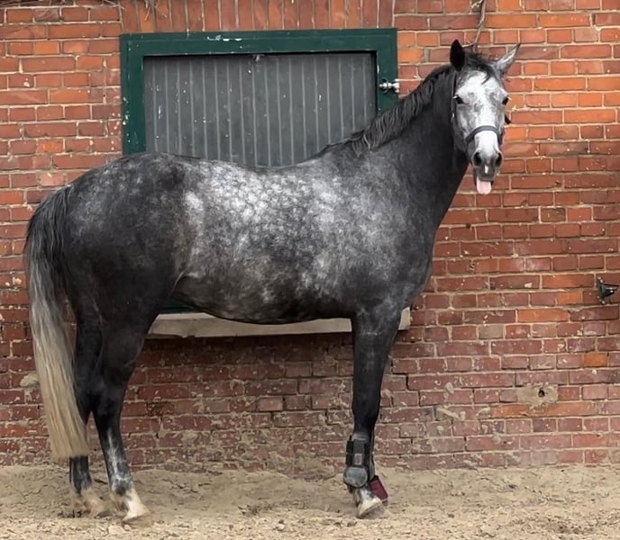 We are looking for a new, loving home for our dear mare. She is 10 years old and has been rated up to 2-star level in dressage. Unfortunately, she is no longer suitable for competitive sport. She has a tendon injury in her front leg that can no longer be fully repaired. She is slightly lame at the trot but does not have any swelling or swelling in the leg. She would be suitable for breeding or as a companion horse. She has previously foaled and was used in breeding due to her longstanding tendon issue. She responded well to initial handling. We also have too many horses and, unfortunately, some have to find new homes. She has a city prize and scored 9.5 points in the mare performance test in jumping. She has a lot of talent and is very rideable. Her height is 1.67 meters, and she is a grey. She is very gentle, well-behaved, social, and affectionate. Price is negotiable. I look forward to any inquiries.