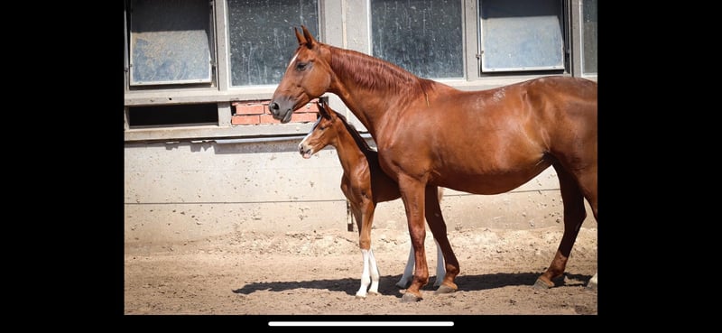 A causa della riduzione del bestiame, vendiamo la nostra fattrice da 3 stelle Tequila, nata nel 2005. Dopo due trasferimenti di embrioni, abbiamo ottenuto nel 2025 3 puledri TOP - vedi ultime immagini. 2 puledri maschi sono in vendita qui. Tequila è in ottima forma nonostante la sua età e si presenta sempre molto bene durante la gravidanza e anche dopo. Ha affrontato il trasferimento di embrioni senza alcun problema. Rimondo: Tequila 251 Tequila è stata premiata con il massimo riconoscimento PSH (Programma di allevamento di cavalli da salto Hannover) con tre stelle ***. Tequila ha diversi discendenti di grande successo nello sport. È gravida per il 2026 dal stallone del Landgestüt Quempas. Dopo lo svezzamento del puledro, può trasferirsi in autunno - oppure eventualmente rimanere in pensione. Posizione 06463