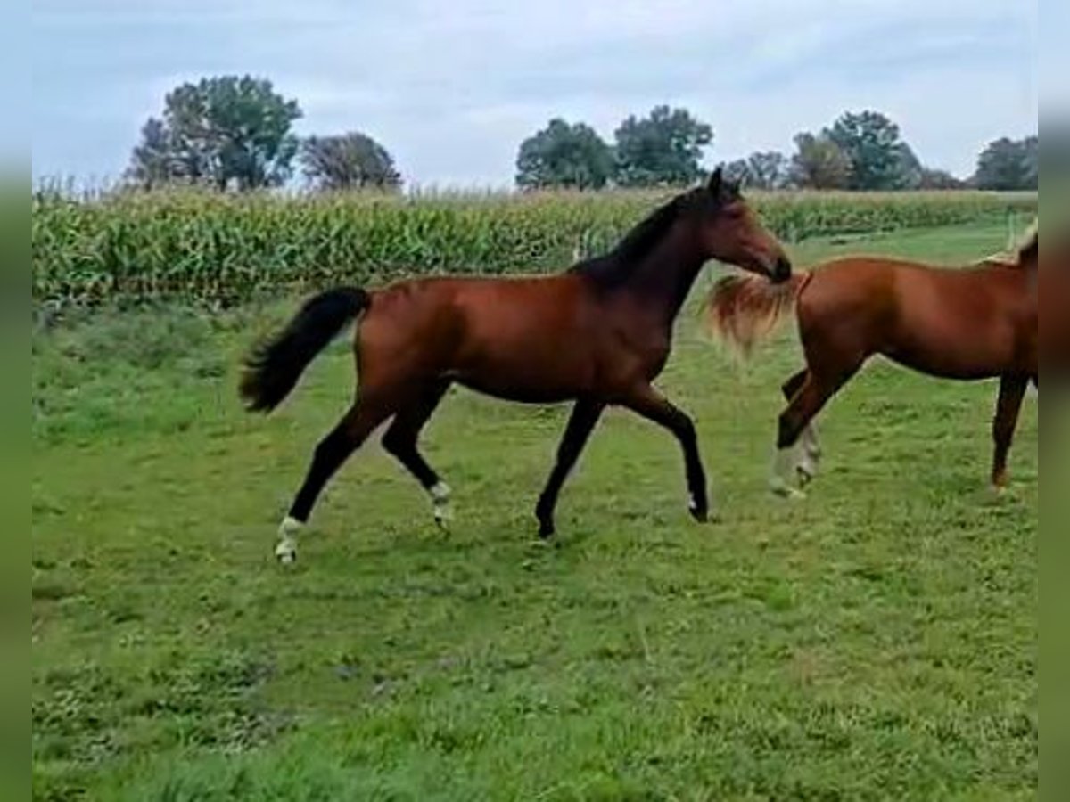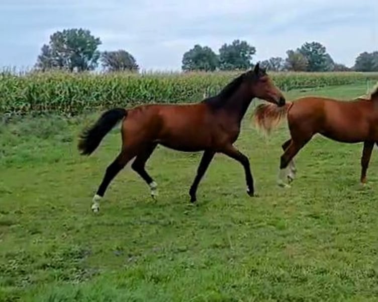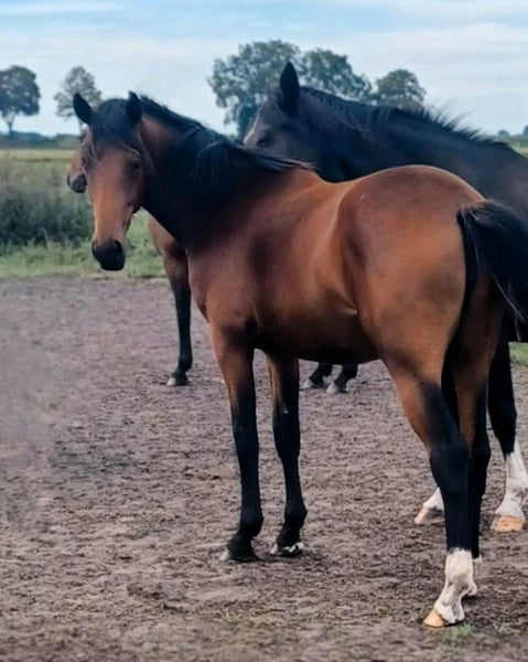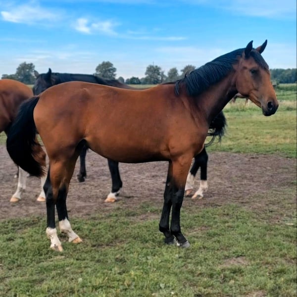 This well-behaved, energetic mare is nearly two years old. With her three outstanding basic gaits and her lovely temperament, she offers a promising future for ALL disciplines of equestrian sports—especially dressage! Perfectly suited for breeding her own future sport, high-level leisure, or family horse. Estimated height around 16.1 hh. Calm, curious, friendly, and well-bred! The mare is in excellent health and has been raised appropriately in a herd on spacious pastures, with excellent care. She is familiar with basic foal manners, regularly sees the farrier, and is regularly dewormed. From a loving and experienced private breeding program—directly from the breeder. We would be happy to introduce this fine, versatile young horse to you personally! Feel free to contact us conveniently via WhatsApp: +49 176 55323449. Her dam was successful internationally in FEI eventing, and also competed nationally in jumping and dressage up to the L level. She descends from the dressage sire and Grand Prix stallion Foundation (Paul Schockemöhle, Gestüt Schafhof), passing on outstanding genetics, top talent, and excellent potential to this beautiful young horse. Her sire is the premium stallion San to Alati FRH. He is successful at S-level and has twice placed at the FEI World Championships for Young Dressage Horses (2023, 2024). Previously, he was Hanoverian Champion 2022 (score 9.2), winner of the sport test (score 9.12), and reserve champion of the 14-day test. Due to his achievements, San to Alati was awarded the Weltmeyer Prize and the FRH suffix by the Hanoverian Promotion Association. He is considered one of the best sons of Secret!