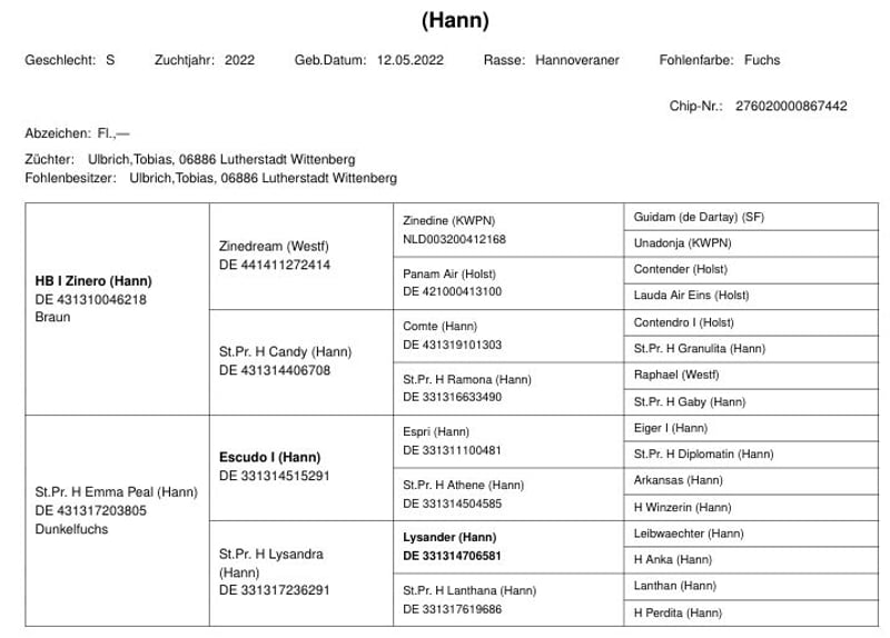 St. Pr. Emma Peal HESCUDO I (HANN.)St. Pr. LysandraESPRI (HANN.)ATHENE (HANN.)
