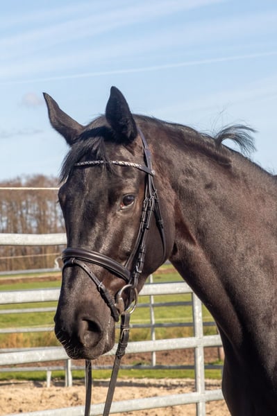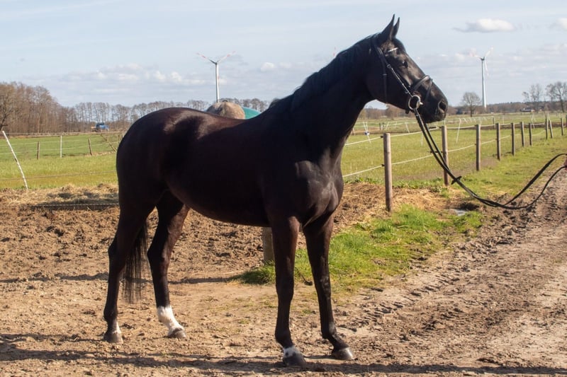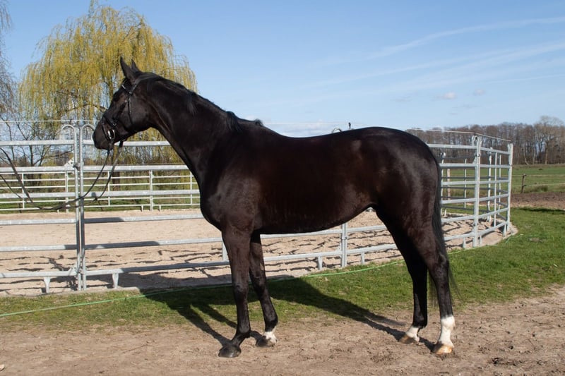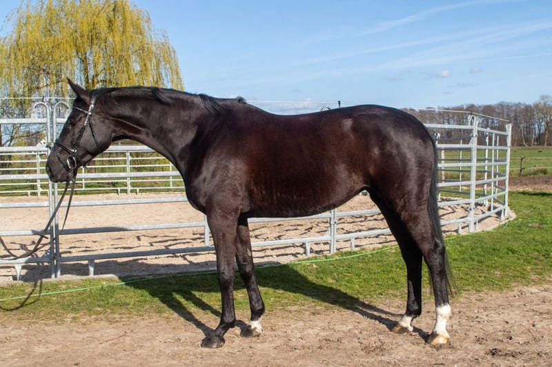 Aus direkter Züchterhand bieten wir diese lackschwarze 4 jährige Stute an, 167 cm. Sie stammt ab von Santos x Hotline x Sandro Hit. Ausgestattet mit drei guten GGA, brav beim reiten und unkompliziert im Umgang. Springt einen kleinen Parcours. Wir können uns diese Stute auch im Vielseitigkeitssport vorstellen. Geht alleine ins Gelände. Auch ideal für Umsteiger. Röntgenbilder liegen vor.