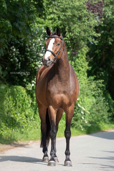 A 4-year-old dark bay Hanoverian mare, currently approximately 16.1 hh, registered in the Hanoverian stud book as a 3-year-old. She possesses a fearless, courageous, and lively character and has grown up in an intact herd with multiple generations. Her noble, expressive head is particularly striking. She demonstrates good basic gaits, a very regular walk with noticeable overstep, and a balanced canter from the hindquarters. She is versatile and suitable for dressage. She has been under saddle for several months and shows herself to be very willing, uncomplicated, and cooperative. Her mental strength, calmness, and composure (see video with plane) provide an excellent foundation. She will make a very good partner for the demanding leisure rider. X-rays are available and show no findings of concern. She is being sold directly by the breeder. Price: negotiable. Contact: 01788688799.