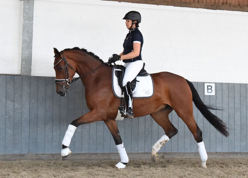 This charming and athletic mare comes from our kennel, who, like her half-siblings, is particularly characterized by her great interior: always motivated and concentrated, balanced and yet hardworking, she gives pleasure every day and takes the rider with her. Footing, dynamic through the body, Fior moves and looks forward to further training every day. X-ray very good