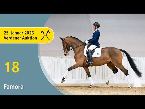 Famora überzeugt nicht nur durch außergewöhnliches Charisma, sondern auch mit Spitzenwerten in den Grundgangarten auf ganzer Linie. Sie absolviert ihr Trainingspensum auf konstant hohem Niveau und ist unter ihrem Reiter Mike Habermann mehrfach hochplatziert und siegreich in Reitpferde- sowie Dressurpferdeprüfungen der Klasse A. Sportname: Famora 4 Turniererfolge: RPF: 1/1. 1/2. 1/3. DPF: A 1/1. 1/2. 2/4. 1/w. 1. Generation Bes. Prämientöchter: HannPrA Festival v. Friedrich der Große. 2. Generation Sportpferde Dressur: Fulltime/Fulltime 4 v. Fidertanz (DRE: S** mit Phyllis Lehner); Fishing for Compliments 7 v. Floriscount (DRE: M* mit Lea Xenia Vossmöller). Aufbauprüfungen Dressur: Fleur La Belle 6 v. Floriscount (DRE: L); StPrA Sugar/Sugar 144 v. San Remo (DRE: L). gekörte Hengste: gek. Hengst Skyfall 59 v. San Amour I (Verden 2017,HM 2017). Auktionspferde: Dwarf Nose FH v. De Niro (FoVA 2012: 19.000 €). 3. Generation Sportpferde Dressur: Tempo Ifce v. Brentano II (DRE: int. Grand Prix mit Guillaume Lundy Cne,Grand Prix Kür -international- 2023,Grand Prix -international- 2023,GP - Grand Prix 2023,GP - Grand Prix 2022,Grand Prix Special -international- 2022,Grand Prix -international- 2022,GP - Grand Prix 2022,GPS - Grand Prix Special 2021,GP - Grand Prix 2021,GPS - Grand Prix Special 2021); Viotti 3 v. Vivaldi (DRE: Grand Prix mit Philipp Hess,Dressurprüfung Kl.S*** mit Piaffe und Passage 2025); Sonny Crockett K v. Soliman de Hus (DRE: S** mit Katrin Knirsch); Sol de Mar v. Sir Donnerhall I (DRE: S** mit Aleksandra KARTASHOVA,FoVA 2011); StPrA With me/With me 5 v. Worldly (DRE: S* mit Nina Kuckartz,Herwart von der Decken-Schau Verden 2009); HannPrA Fantastic Fritzi v. Fürst Wilhelm (DRE: M* mit Annika Hencke). Aufbauprüfungen Dressur: Rubens 137 v. Rascalino (DRE: L,FoVA 2006); gek. Hengst Dynamit de Luxe/De Luxe 30 v. Donnerhall (DRE: L,Verden 2000,HM 2000: 80.500 €). Auktionspferde: Die Schatzkiste v. Dynamic Dream (FoVA 2024); D-Day v. Don Frederico (FoVA 2007); Frodo v. Fabriano (VA 2008). Bes. Prämientöchter: HannPrA Rocket Ronja v. Rock Springs; StPr Paris v. Prince Thatch; StPr Daylight v. Donnerhall (Ratje Niebuhr-Schau Verden 2002). 4. Generation Sportpferde Springen: Soter v. Stakkato (SPR: int. 1,40 m mit Jens Christ,FoVA 2006); Granik 2 v. Graf Top (SPR: 1,40 m mit Peter Wetzel,VA 2006); Diacord 3 v. Diarado (SPR: 1,35 m mit Soenke Kohrock); gek. Hengst Quick Check v. Quidam de Revel (SPR: 1,35 m mit Julia Schadock,Verden 2011,FoVA 2007: 35.000 €); Cicero's Uno v. Cicero Z (SPR: 1,30 m mit Christine Wecke); Chicago 144 v. Casillas (SPR: 1,30 m mit Andrea Di Silvestro); Cleopatra/Concetto's Joy v. Concetto (SPR: 1,30 m mit Meike Freitag). Aufbauprüfungen Dressur: Willy Brown 2 v. Warkant (DRE: M mit Linden,Tom van der,VA 2000). Aufbauprüfungen Springen: Nomer Edno v. Numero Uno (SPR: 1,30 m mit Dimitar Kyuchukov); Dynamic Daisy/Dynamic Daisy 2 v. Duke of Hearts (SPR: L,Gelände: L); Concetta del Mar v. Concetto (SPR: L); Anyway 45 v. Acord II (SPR: L,VA 2004). Aufbauprüfungen Gelände: Dynamic Daisy/Dynamic Daisy 2 v. Duke of Hearts (SPR: L,Gelände: L). Auktionspferde: Skyliner v. Stakkato (FoVA 2013); Q7 v. Quidams Rubin (FoVA 2008); Einstein v. Escudo I (FoVA 2005); Helena v. Hohenstein (FoVA 2004); von Landor S v. Landor S (FoVA 2001); Acalyno v. Acord II (FoVA 1999); Advokat/v. Acord II v. Acord II (VA 1997); Galway v. Graf Grannus (FoVA 1993); Wedanja v. Weltmeyer (VA 1994). Bes. Prämientöchter: HannPrA Coco Chanel v. Christian's Chacco; HannPr Lacorada II v. Numero Uno; HannPr Lacorada v. Numero Uno (Herwart von der Decken-Schau Verden 2014); StPr Labonita v. Lord Z; StPr Gina v. Graf Top; StPr Wild Card/Wild Card 8 v. Warkant (Louis Wiegels-Schau Hohenhameln 1997); StPr Callas/Callas 15 v. Calypso II. 5. Generation Sportpferde Dressur: Solo Dancer 3 v. Sir Donnerhall I (DRE: S*** mit Friederike Demel,FoVA 2010); gek. Hengst Lord of Loxley/Lord of Loxley 2 v. Lord Sinclair I (DRE: S*** mit Hans Peter Minderhoud,GP - Grand Prix 2013,GP - Grand Prix 2013,GP - Grand Prix 2012,Dressurpf.Bundeschamp.Kl.L 2005,MS-Handorf 2002); gek. Hengst Florenz/Florenz 71 v. Florencio I (DRE: S** mit Madita Rentz,Dressurpferdeprfg. Kl.L Bundeschampionat 5 jährige 2016,Bundeschampionat f. Reitpferde 2015,Finalteilnehmer Bundeschampionat 4j.Reitpferde 2015,Vechta 2013,FoVA 2011: 25.000 €); Sedona 5 v. Sir Donnerhall I (DRE: S** mit Alexandra Sessler); Lux-Oil Gatsby v. Grosso Z (DRE: S** mit Häschke,Antje); HannPrA Fantastic Lady S/Florencia S v. Florencio I (DRE: S* mit Jennifer Mieves); Fantastic Lady/Fantastic Lady 4 v. Florencio I (DRE: M** mit Jenna Sophie Wichern,FoVA 2009: 24.500 €); MSJ Felino v. Franziskus (DRE: M* mit Nico Falk); MSJ Secret Lady v. Secret (DRE: M* mit Emma Kanerva); San Pablo/Skywalker 65 v. Sandro Hit (DRE: M* mit Daniela Müller,FoVA 2006: 103.000 €); gek. Hengst Law and Order/Libertango v. Landadel (DRE: M mit Scholz,Thomas,Oldenburg 1993,FoVA 1991); Cascarino v. Pik Bube I (DRE: M mit Hug,Manuela). Sportpferde Springen: Lorenz 78 v. Lordanos (SPR: 1,40 m mit Marco Lilienbecker); WestfHPr Lady la Vie/Lady La Vie v. Lordanos (SPR: 1,40 m mit Franziska Schroer); Show Jumper v. Staron (SPR: 1,40 m mit Jessica Freye,VA 2013); gek. Hengst C'est la Vie/C'Est la Vie 14 v. Cor de la Bryere (SPR: S mit Lugge,Hans,Aachen 1995); Lordania/Lordania 5 v. Lordanos (SPR: 1,30 m mit Johanna Vauth); Count Alaric v. Graf Grannus (SPR: M mit Patrick Nisbett,FoVA 1998); Agronit S v. Acord II (SPR: M mit Voigt,Julia); Raphaela/Rhapsodie 119 v. Raphael (SPR: M mit Kriegesmann,Eva); FEDOR 69 v. Freiherr (SPR: M mit WULLKOTTE,FRANK). Aufbauprüfungen Dressur: Vaiano 2 v. Veneno (DRE: M mit Stefanie Beyer); Zauberprinz 10 v. Zoom (DRE: L,Finalteilnehmer Bundeschampionat 3j.Reitpferde 2022); HannPr Feodora/Feodora 130 v. Fürstenball (DRE: L); gek. Hengst For Austria v. For Romance I (DRE: L,Vechta 2019); HannPrA Fantastic Lady II/Fantastic Lady III v. Fl