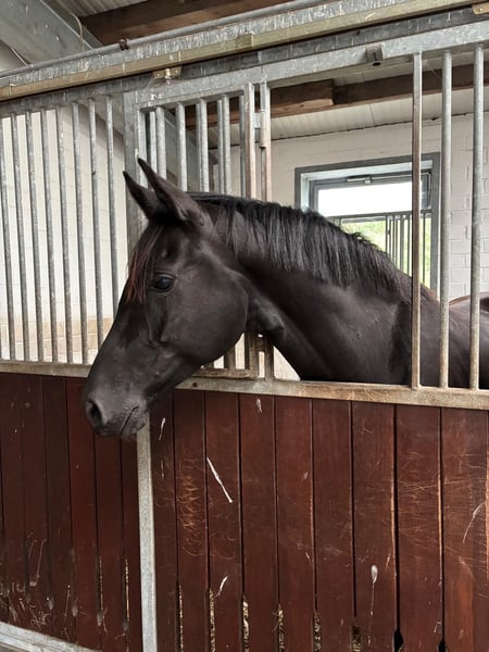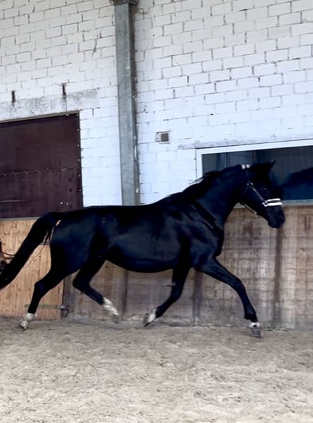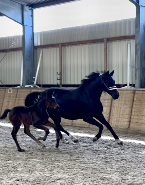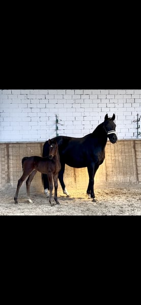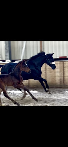 Wir verkaufen schweren Herzens aus liebevoller Züchterhand unsere Hannoveraner Stute „Flair“. Flair ist 6 Jahre alt, wurde bereits anlongiert und hat bisher unkompliziert drei Fohlen bekommen. Sie ist für 2026 wieder tragend von dem Top Vererber Bonds (Benicio x Sir Donnerhall). Flair ist das „Rundum-Sorglospaket“, denn sie hat nicht nur zum vierten Mal problemlos aufgenommen, sondern hat auch genauso problemlos ihre Fohlen zur Welt gebracht. Sie ist sehr menschenbezogen und ausgesprochen lieb. Ein wunderschönes Pferd mit traumhaften Bewegungen. Diese Schönheit in lackschwarzem Fell und 4x weiß sowie die herausragenden GGA hat sie auch an ihre Fohlen weitergegeben. Flairs Abstammung lässt keine Wünsche offen: For Romance I x Londonderry x Florestan I. Aktuell genießt sie das Leben als Zuchtstute, sie ist herdenverträglich (eher rangniedrig), regelmäßig entwurmt, geimpft (auch Herpes) und beim Schmied vorgestellt. Flair ist hier als Schnäppchen zu erwerben, da wir unsere Zucht verkleinern müssen. Selbstverständlich ist Flair gesund und reitbar, darf jedoch nicht im Turniersport laufen. Ich kann sie mir aber nicht nur als unkomplizierte Zuchtstute, sondern auch als tolles Reitpferd vorstellen, da sie sehr unerschrocken und besonders gutherzig ist. Weitere Infos hierzu gern telefonisch. Für weitere Videos und ernsthaftem Interesse melden Sie sich gerne unter 0173/8547754. Flair geht nur an einen Bestplatz! Flair wird tragend verkauft, das Fohlen, das jetzt bei Fuß läuft kann mitverkauft werden bzw. ist einzeln zu erwerben.