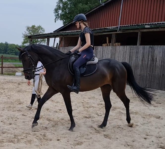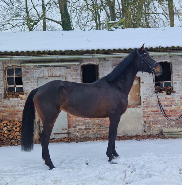 With a heavy heart, we are selling our 7-year-old Hanoverian mare (Stolzenberg x Cormint), standing at 16.1 hh. Smilla has already had a foal and has proven to be an excellent mother. She is currently in training and jumps small courses at shows. In the field, she is very brave and is familiar with tractor and car traffic. Under saddle, she has a lot of energy and is therefore suited only for experienced and delicate riders. We could also very well imagine her as a broodmare in a new home. Smilla is farrier- and loading-friendly. Videos available upon request.