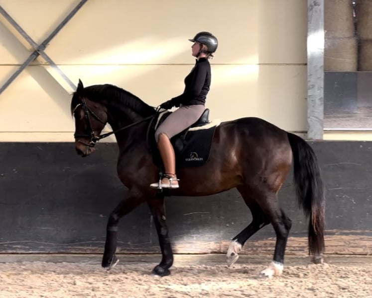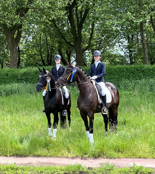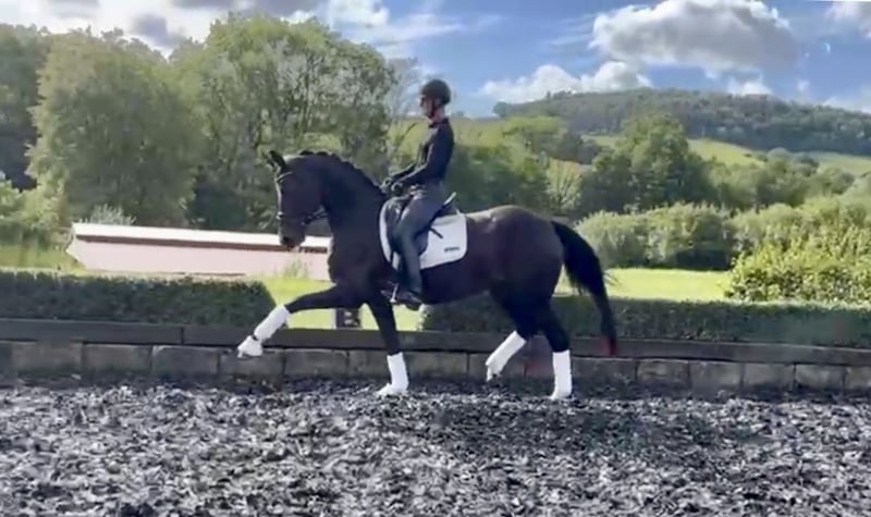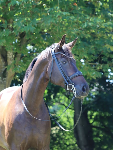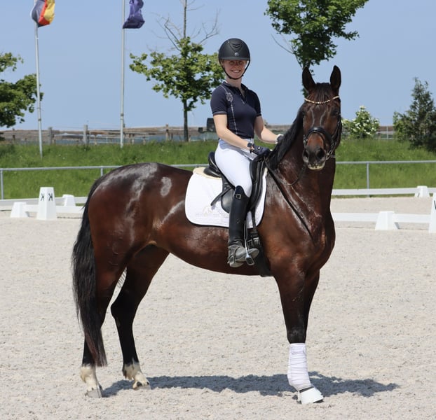 Miss Croco is sired by the top stallion Tannenhofs Fahrenheit, who successfully competed up to Grand Prix under Anja Plönzke. Fahrenheit Gt has already produced several offspring that are also successful nationally and internationally up to Grand Prix. On the dam's side, Croco is by the stallion Rubinero, who himself was successful up to PSG and has produced offspring that have reached Grand Prix. Miss Croco is an expressive mare with a lot of fighting spirit and ambition. She is characterized by her absolute willingness to perform, as well as her three excellent basic gaits. The stunning mare has been in our possession since she was a foal (at 6 months old). At three years old, she was gently backed and subsequently covered, allowing Croco to spend another summer in the pasture. In the winter after weaning her foal, Croco was re-trained and ridden further. In 2022, the Verband premium mare Miss Croco gave birth to a colt by Destello (successful under Beatrice Buchwald), and two years later, she passed her mare performance test. Currently, the mare is at Dressage Horse M level, with flying changes and working pirouettes already started. She confidently performs trot and canter traversals. Due to her willing nature, she can sometimes be a bit over-motivated; on the other hand, this makes her not lazy and suitable for a well-riding junior. *** Suitable for juniors or young riders *** A mare with a lot of charm and heart, possessing a certain resilience for sport and breeding.