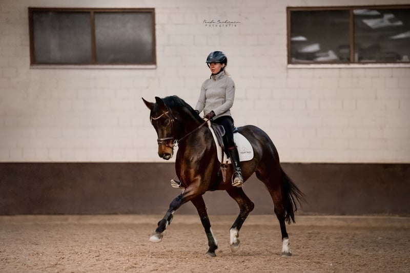 Mademoiselle Croco descend du célèbre étalon Tannenhofs Fahrenheit par son père, qui a couru avec succès jusqu'au Grand Prix sous la conduite d'Anja Plönzke. Fahrenheit Gt a déjà produit plusieurs descendants qui ont également réussi au niveau national et international jusqu'au Grand Prix. Du côté maternel, Croco est issue de l'étalon Rubinero, qui a lui-même été performant jusqu'au PSG et a engendré des descendants jusqu'au Grand Prix. Mademoiselle Croco est une jument expressive avec beaucoup de cœur et d'ambition. Elle se distingue par sa volonté de performance absolue ainsi que par ses trois excellents allures de base. La magnifique jument est en notre possession depuis son jeune âge (à partir de 6 mois). À 3 ans, elle a été montée avec précaution et a ensuite été saillie, ce qui lui a permis de passer un été supplémentaire au pré. En hiver, après le sevrage du poulain, Croco a été remise au travail et a continué à être montée. En 2022, la jument primée, Mademoiselle Croco, a donné naissance à un poulain mâle de Destello (performant sous Beatrice Buchwald), et deux ans plus tard, elle a passé son test de performance de jument. Actuellement, la jument est au niveau Dressurpferde M, les changements de pied et les pirouettes au travail ont déjà été commencés. Elle maîtrise déjà avec assurance les traversées au trot et au galop. En raison de son caractère désireux de performer, elle peut parfois être un peu trop motivée, mais d'un autre côté, elle n'est pas paresseuse et peut convenir à un junior bien monté. *** Convient aux juniors ou aux jeunes cavaliers *** Une jument avec beaucoup de charme et de cœur, qui possède une certaine robustesse pour le sport et l'élevage.