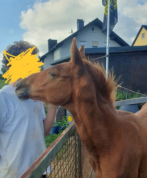 Zum Verkauf steht ein Hannoveraner Stutfohlen in chicer Fuchsfarbe, das im März 2025 geboren wurde und ab September von der Mutter abgesetzt werden kann. Sie ist sehr menschenbezogen und hat einen ausgeglichenen und gelassenen Charakter, wie ihre Mutter. Von ihr hat sie auch ihre langen Beine und Größe: die Mutter hat ein Stockmaß von 1.75 m. Sie besticht außerdem durch ihre schönen Bewegungen mit viel Schulterfreiheit, Elastizität und Ausdruck. Interessant ist auch die Abstammung: das Fohlen ist aus einer dänischen Halbblutstute von der Rennlegende Selkirk xx gezogen. Der Vater ist der vielversprechende Oldenburger Escanto PS, der den Titel des Bundeschampions der vierjährigen Hengste sichern konnte, Bestnoten ( 9.43 und 9.12 ) bei der HLP erzielte und auf Grund seiner qualitätsvollem Nachzucht zum Oldenburger Hauptprämiensieger 2024 gekürt wurde. Ihre Jugend genießt die kleine gerade ganztägig auf der Weide, sie kennt aber auch den Stall, das Hängerfahren sowie das Fohlen ABC. Sie wird nur in beste Hände verkauft! Für weitere Fragen stehe ich gerne zur Verfügung, schreiben Sie mir einfach