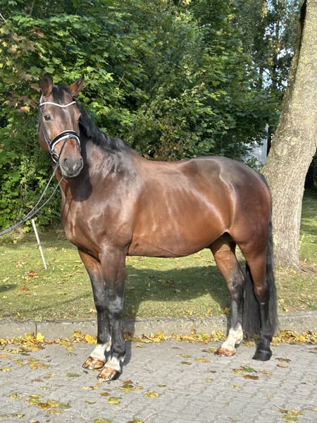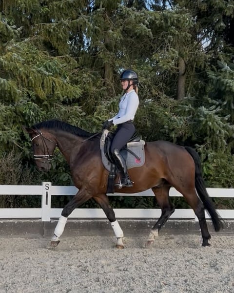 Zum Verkauf steht ein ausgesprochen lieber und ehrlicher 11-Jähriger Wallach aus bewährter hannoverscher Abstammung (Rotspon – Wittinger). Er misst ca. 167 cm und überzeugt durch seine angenehme Art und sein ausgeglichenes Wesen. Ein echtes Verlasspferd im Alltag. „Rudi“ zeigt sich im Umgang wie auch unter dem Sattel stets brav, geduldig und nervenstark. Er wird aktuell von einem jungen Mädchen sowie auch von Reitanfängern geritten und macht dabei immer einen tollen Job. In der Arbeit zeigt er sich zuverlässig, er beherrscht fliegende Wechsel und weitere M-Lektionen. Auch im Springen wurde er zu Hause bis etwa 1 m gefördert, ohne weitere Ambitionen. Er geht alleine und in der Gruppe entspannt ins Gelände, ist schmiede- und verladefromm sowie vorne beschlagen. Eine klinische AKU ohne Befunde liegt von vor 4 Jahren vor. Röntgenbilder wurden bisher nicht angefertigt, weil er immer gesund war. Ein tolles Pferd für Reiter, die einen zuverlässigen, sicheren und gut ausgebildeten Partner für Dressurarbeit, Springen und Gelände suchen. Für weitere Fragen oder ein Kennenlernen melden Sie sich gerne telefonisch oder per WhatsApp unter 01725817647