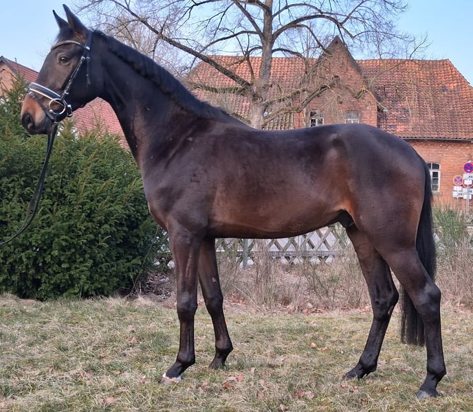 Hannoverian Gelding – Promising Youngster for Dressage We are offering a promising Hannoverian gelding, born in 2023, for sale. The dark bay young stallion impresses with his elegant appearance and balanced temperament. Standing at 16.1 hh, he is the perfect size for ambitious riders seeking a well-developed and eager-to-learn partner. This young Hannoverian has already been backed. His open-minded nature and pleasant character make him a reliable companion for building a successful dressage career. Thanks to his solid pedigree, he has the necessary foundation to develop further in the higher levels. This promising young horse is ideal for riders looking for a talented and well-mannered dressage partner. If interested, we look forward to hearing from you to discuss further details and arrange a viewing.