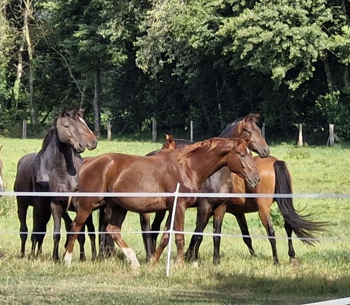Vendemos nuestro potro de 2 años y medio, crudo, de la pradera de verano. Absolutamente correcto y con la cabeza clara, este joven seguramente se convertirá en un excelente caballo de doma o de salto. No es posible sacarlo del grupo para grabar videos, pero puede venir a verlo en persona.