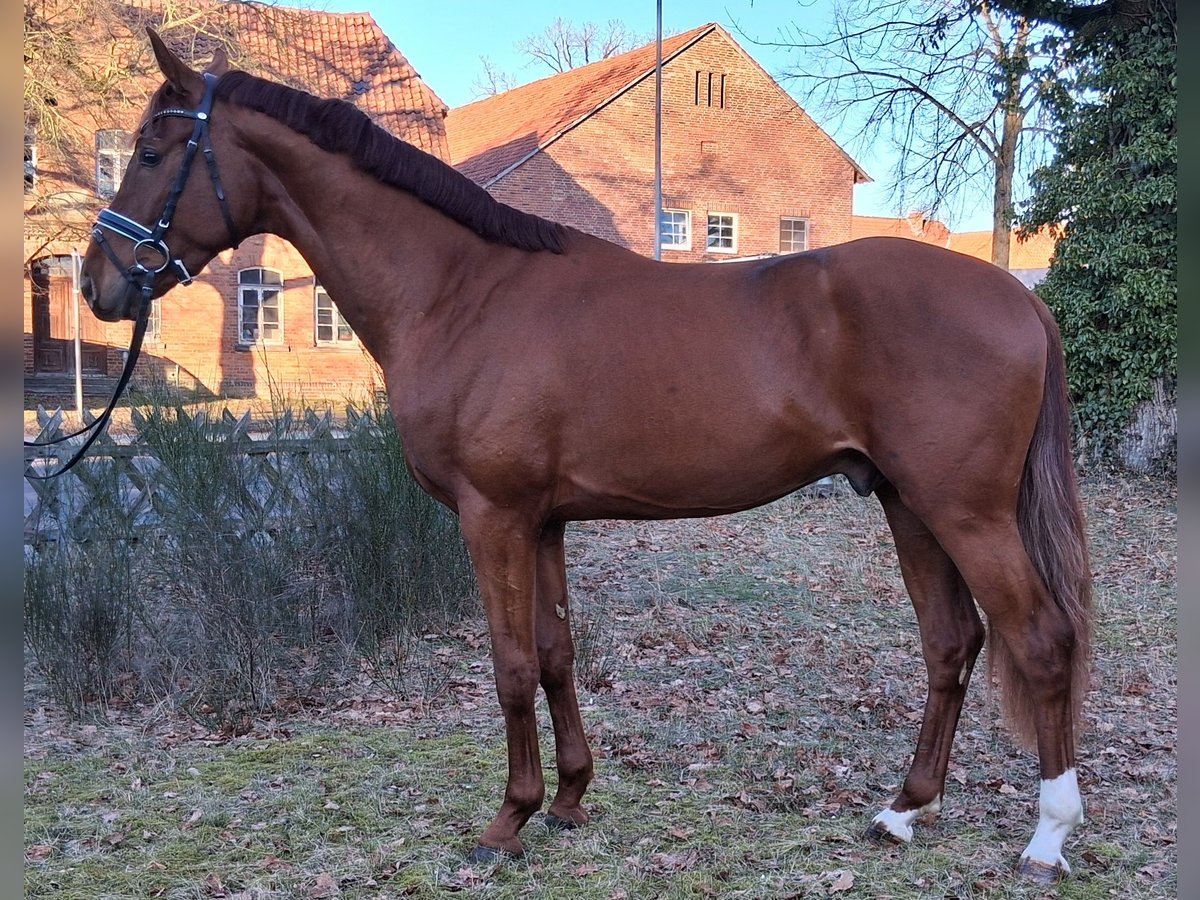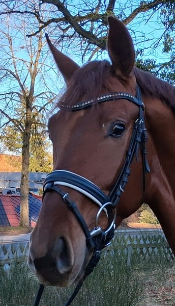 Hannoverian gelding, born in 2023, chestnut, with an approximate height of 16.1 hh. This promising young stallion impresses with his elegant appearance and solid basic training in dressage. As a typical Hannoveraner, he combines quality movement, a strong willingness to learn, and a friendly temperament, making him suitable for both ambitious amateurs and professional dressage stables. His well-mannered nature and pleasant character distinguish him. A promising partner for a future in the dressage arena!