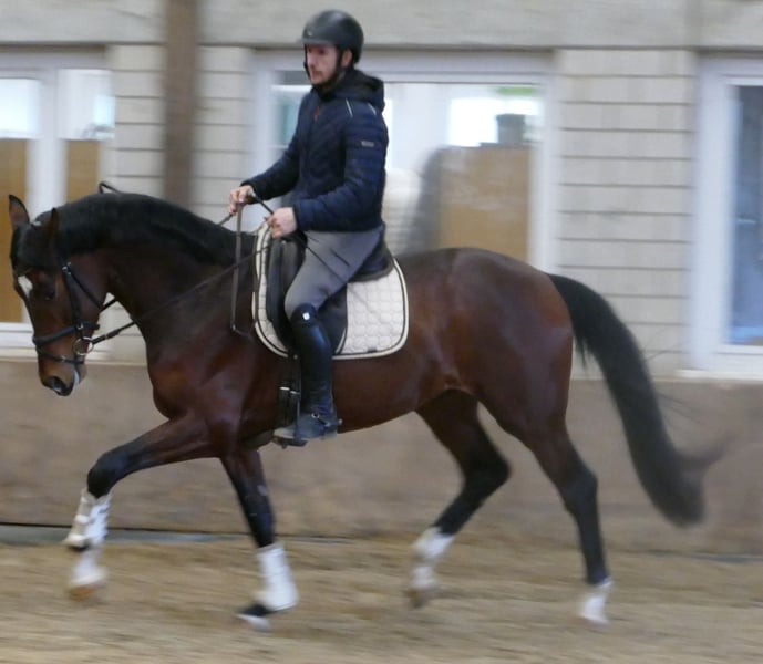 From a top breeding farm, half-brother to Vivino and two other licensed stallions, two half-siblings successful in Grand Prix competitions, good X-ray results available, including the back. A performance-oriented gelding with an excellent temperament, previously only lunged, will be saddle trained soon. A 4-year-old full brother achieved an 8.0 in dressage test class A (2nd place) and an 8.2 in riding horse class (3rd place) this year and is no longer for sale.