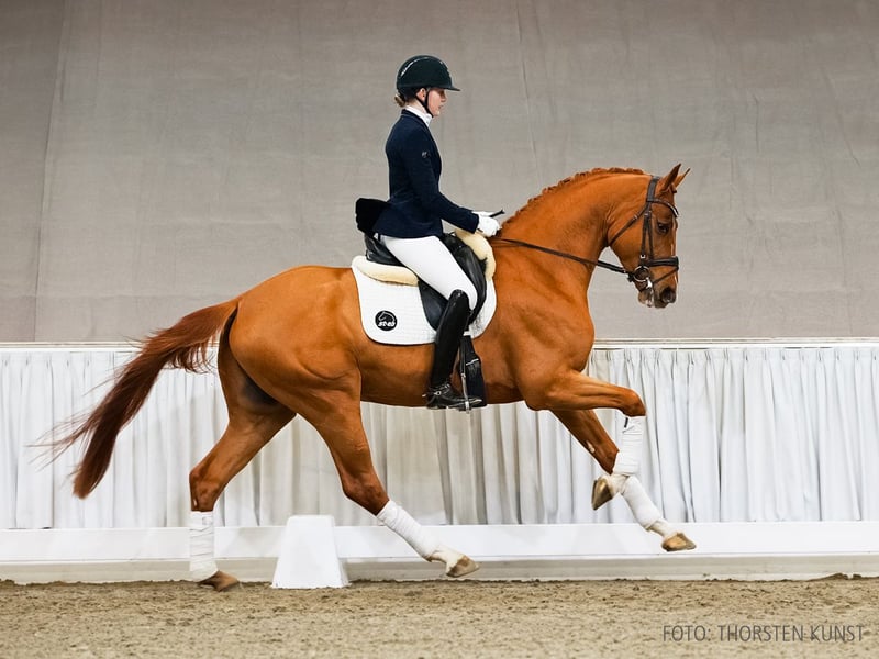 Das Pferd ist ein Verdener Auktionspferd und wird am 18.04.2026 onlive versteigert. Vom 6.04. bis zum 18.04. kann das Pferd jeden Tag beim öffentlichen Training besichtigt und ausprobiert werden. Das Startgebot bei der Versteigerung ist 8.000 Euro. Sony ist ein extravaganter Dressurwallach mit sportlich geprägter Blutlinienkombination. Mit Ellen Bruun platzierte er sich bereits an zweiter Stelle in einer Reitpferdeprüfung und tritt damit in die Fußstapfen seiner Halbschwester Freak Me Out v. Floriscount, die mit Kristine Möller-Engel in Dressurpferdeprüfungen der Klasse M siegreich ist. Großmutter StPr Passion stellte die Sportstute Fit for Fun v. For Compliment, erfolgreich im Grand Prix mit Anna-Katharina. Auch Goldmeyer (Grand Prix mit Anne Torp Madsen) und Giaccomo (Grand Prix mit Andrea Baumgart) zeichnen diesen erfolgreichen Mutterstamm aus. Sportname: Sony 34 Sporterfolge: RPF: 1/2. 1. Generation Aufbauprüfungen Dressur: Freak me Out v. Floriscount (DRE: M mit Kristine Möller-Engel). 2. Generation Sportpferde Dressur: Fit for Fun 16 v. For Compliment (DRE: Grand Prix mit Anna-Katharina Gerber,Dressurprüfung Kl. S*** - Grand Prix Kür - 2023,Dressurprüfung Kl. S*** - Grand Prix Kür - 2023,Dressurprüfung Kl. S*** - Grand Prix Kür - 2021,Dressurprüfung Kl.S*** mit Piaffe und Passage 2018,Dressurprüfung Kl.S*** mit Piaffe und Passage 2018,Dressurprüfung Kl.S*** mit Piaffe und Passage 2018). Aufbauprüfungen Dressur: Santa Cruz 43 v. Sir Donnerhall I (DRE: L). Auktionspferde: Fidelio v. Floriscount (VA 2025). 3. Generation Sportpferde Dressur: Bereniece v. Bonifatius (DRE: M** mit Sabine Steinborn). Aufbauprüfungen Dressur: Flower/Fine Flower 2 v. Fidertanz (DRE: L). Besondere Sportergebnisse: Dario-Fo v. Dimaggio (Championat f. Reitpferde 2008,VA 2009). Auktionspferde: Be Happy v. Bonard de Charry (VA 2017); Lanciano v. Lauries Crusador (FoVA 2008); De Rossio Grande v. Don Crusador (VA 2011); Ryan's Magic v. Rubinstein I (VA 2003). Bes. Prämientöchter: StPr Passion v. Prince Thatch. 4. Generation Sportpferde Dressur: Goldmeyer v. Galvano (DRE: Grand Prix mit Anne Torp Madsen,Dressurprüfung Kl. S*** - Grand Prix Special - 2016,Dressurprüfung Kl. S*** - Grand Prix de Dressage 2016,Dressurprüfung Kl. S*** - Grand Prix Special - 2016); Giaccomo 3 v. Grande (DRE: Grand Prix mit Baumgart,Andrea Dr.,Championat für Reitpferde m.M. 1986,Championat für Reitpferde m.M. 1985,Championat für Reitpferde m.M. 1985,VA 1984); Don Hitmeyer v. Diamond Hit (DRE: S*** mit Carolin Heckenberger); Byzanz 11 v. Benicio (DRE: S** mit Nikolaus Torklus); Rubin 550 v. Rosentau (DRE: S** mit Susanne Rommel); La Grandessa v. Leibniz (DRE: S** mit Friederich,Irena); World Play v. World Cup I (DRE: S** mit Ramschütz,Silke); Zuperior v. Zack (DRE: S* mit Henriette Schmidt); Quuno v. Quaterback (DRE: S* mit Christoph Schönherr,VA 2012); Donavan 30 v. Dressage Royal (DRE: S* mit Clarissa Dennert); Weltlady/Charlottenhof`s Weltlady v. Weltmeyer (DRE: S* mit Stephan Köberle); Lemon Girl v. Lemon Park (DRE: S mit Winter,Heike); Elite Salsa de Jeu/Salsa de jeu v. Serano Gold (DRE: M** mit Jasmin Kreipl); Dirty-Diana v. Decamerone (DRE: M** mit Linda Kulb); gek. Hengst Don Laurie II/Tannenhof's Don Laurie II v. Don Schufro (DRE: M** mit Nicole Teichmann,Verden 2005,HM 2005); Screenshot S v. Secret (DRE: M* mit Pauline Samrei); De Noblesse v. Don Nobless (DRE: M* mit Nicole Louven); Ferdinando-Finissimo v. Fiorissimo (DRE: M* mit Heike Schmidt-Bosse); Gill Flanell v. Grey Flanell (DRE: M* mit Cora Bachmann); Renoir l'unique v. Rascalino (DRE: M* mit Tanja Illges-Holl); Donna Laura v. Don Schufro (DRE: M* mit Nicole Teichmann); Well Done 46 v. Weltmeyer (DRE: M* mit Nina-Vanessa Henke). Sportpferde Springen: Laurentio S v. Landor S (SPR: 1,35 m mit Axel Freitag); Singular Lady v. Singular Joter I (SPR: M mit Andreas Tölle); Graziano 15 v. Grande (SPR: M mit WIENFORT,SVEN). Aufbauprüfungen Dressur: Santa Catalina/Santa Catalina 3 v. Sarotti Mokka Sahne (DRE: M mit Laura Stiller); gek. Hengst Bonhoeffer/Bonhoeffer 2 v. Bon Coeur (DRE: M mit Catja Thomsen,Verden 2021,HM 2021: 300.000 €); Ferdi Fuchs 2 v. For Gold (DRE: M mit Nathalie Arenhövel); StPr Bella Belicia v. Belissimo M (DRE: M mit Ann-Kathrin Wilting); Diabella Gold v. Don Olymbrio L (DRE: L); Florentine 137 v. For Dance (DRE: L); Different 5 v. Daytona (DRE: L); HannPr Fürstin Grande v. Fürst Romancier (DRE: L); Safari 51 v. San Amour I (DRE: L); Whisper CH v. World Cup I (DRE: L). Aufbauprüfungen Springen: Latina 216 v. Le Primeur (SPR: 1,30 m mit Kai Schrammel); Blayde v. Balou du Rouet (SPR: L). Aufbauprüfungen Gelände: Boracay v. Belissimo M (Gelände: L*). Besondere Sportergebnisse: gek. Hengst Weltmeyer/WELTMEYER v. World Cup I (Championat für Reitpferde m.M. 1987,Verden 1986,HM 1986,Sieger Körung Verden 1986,Freiherr von Stenglin-Preis Verden 1988,Bester Hengst des Jahrgangs 1988,Sieger DLG Frankfurt 1989,Hannoveraner Hengst des Jahres 1998). gekörte Hengste: gek. Hengst Vivaldinho v. Valdiviani (MS-Handorf 2025); gek. Hengst Alphabeat v. Ampere (NLD) (Dänemark 2014); gek. Hengst Don Laurie I/Don Laurie v. Don Schufro (Oldenburg 2001). Auktionspferde: Visconti v. Von Und Zu (VA 2025); Zündstoff v. Zoom (FoVA 2020); Fidermeyer v. Fidertanz (VA 2023); Catch me v. Conthargos (FoVA 2019); Der Allwördener v. Don Index (VA 2019); Fred v. Franziskus (VA 2020); Celeste-Laura v. Chequille (VA 2015); Quandam S v. Quaterback (VA 2013); Sarkozya/Sinka v. Sarkozy (FoVA 2009); Summertime S v. Samarant (VA 2011); Cataldo v. Chico's Boy (VA 2008); Winnipeg 241 v. Weltmeyer (VA 2004); Expose v. Escudo II (FoVA 1998). Bes. Prämientöchter: HannPrA Remarkable S v. Revolution; HannPr Fleur v. For Romance I; HannPr Campera v. Carabas; StPr Freiheit v. Fairbanks; HannPr Sunday Grande v. Stedinger; HannPrA Balbina Lerup v. Belissimo M; StPr Ballerina Lerup v. Belissimo M; StPr Donna-Laura v. Don Schufro; StPr Laura v. Lauries Crusador; StPr