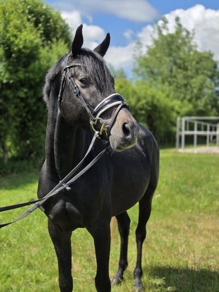 Zum Verkauf steht direkt vom Züchter dieser charmante 4 jährige Wallach. Er befindet sich aktuell in Beritt und zeigt sich hier sehr umgänglich und lernwillig. Im Freispringen zeigt er sich geschickt und vermögend. Hier reift ein toller, kopfklarer Sportpartner heran. Aktuell hat er Stockmaß von ca. 1,63 m. Er stammt ab von Casino Berlin aus einer Malachit xx x Radiator Mutter. Probereiten nach Absprache möglich. Angaben zum Mutterstamm: Abgesicherter Mutterstamm mit viel Springvermögen und Intelligenz