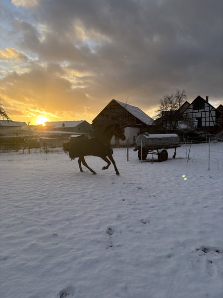 Calimero MW ist ein altersgemäß ausgebildeter talentierter Wallach mit erster Turniererfahrung. Ganz aktuell Springpferde A** mit 8,1. Er ist beim Züchter aufgestallt und geht tagsüber in einer Kleingruppe auf den Auslauf/Weide. Er ist sehr neugierig, verspielt und eher rangniedrig.
