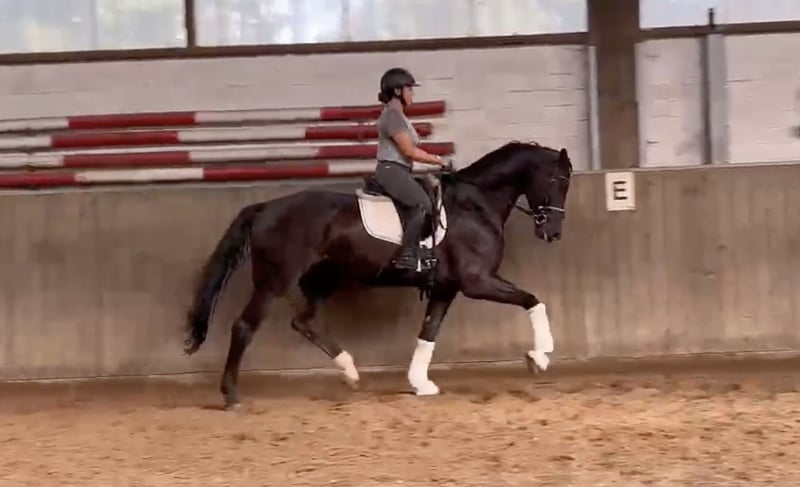 For sale is an impressive gelding, born in 2020. He presents himself in an elegant black coat and has a height of 171 cm. This black horse is characterized by his willingness to work and talent for collection. If you are interested or need further information, please feel free to contact me. Visit us and get to know this great gelding in person!