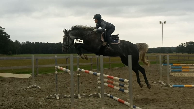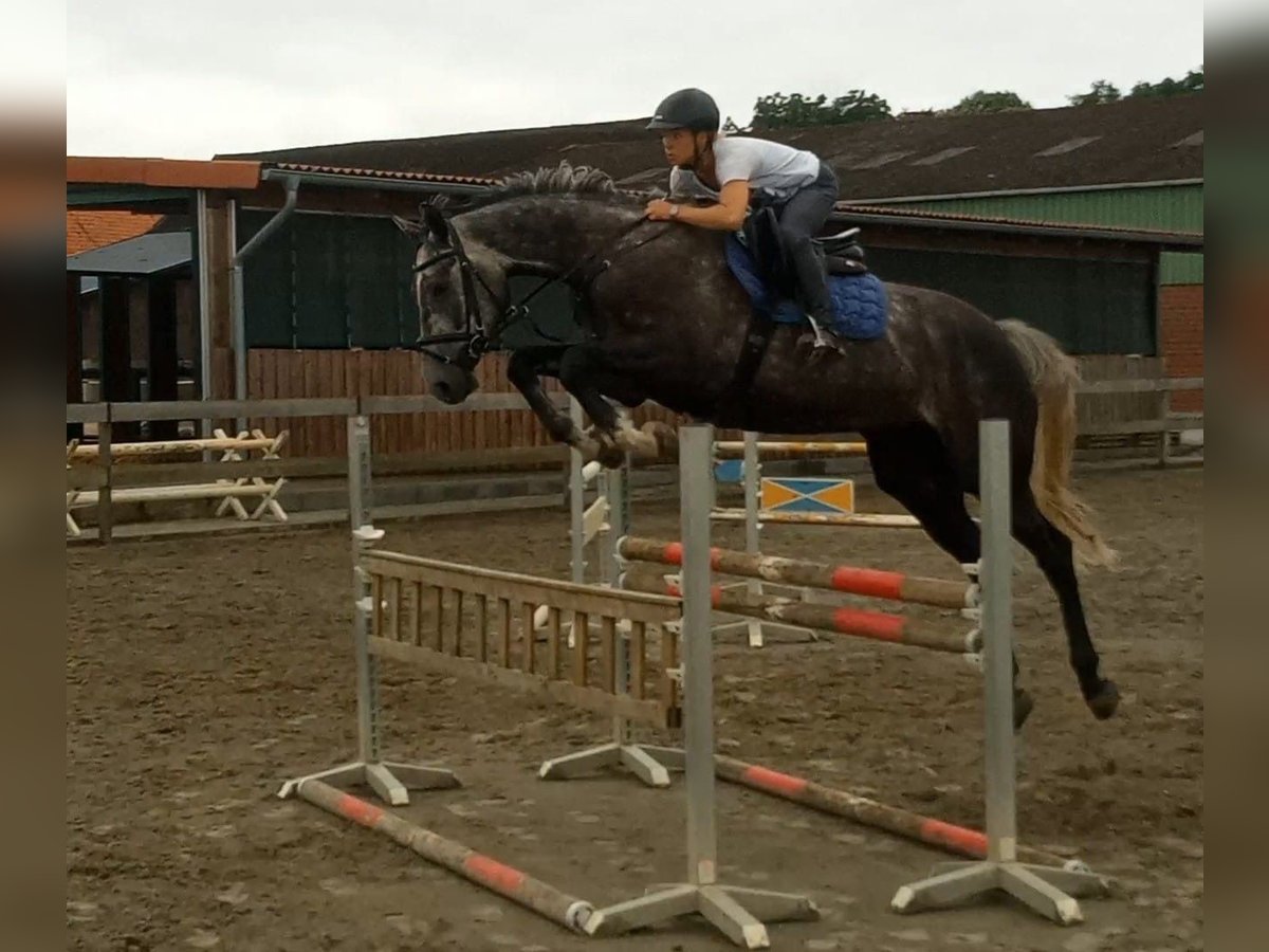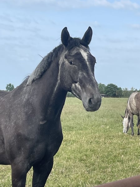Catch M is a still-growing, sweet but shy gray gelding by Colman from our own breeding. He was started under saddle at the age of 4, but due to his growth, I put him back out to pasture at 5 years old. He first needed to learn how to handle his body. Currently, he stands at 1.75m, but I believe he will continue to grow. As of now, or since last autumn, he has been further trained (L-level courses are no problem, see video). He shows himself to be very rideable and uncomplicated. He is currently kept in a group open stable. His mother was started under saddle after weaning Catch M. She was placed up to S* at the age of 8 and was then sold to France (she had only one foal). Several successful show jumpers up to S*** have already come from the mother line (including participation in the World Cup final in Riyadh 2024). Catch M was X-rayed in January 2022 (18 images), and there were no significant findings. Catch M is already registered as a competition horse and has been regularly vaccinated (+ dewormed, of course).