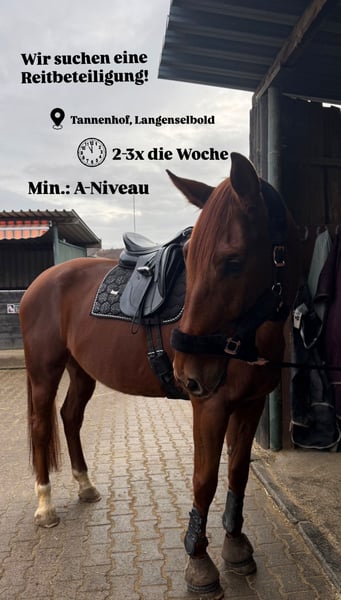 Wir suchen für unseren fast 8-jährigen Hannoveraner-Wallch Farbenspiel alias Fips (Stockmaß 174 cm) eine zuverlässige und engagierte Reitbeteiligung, die ihn 2x pro Woche bei uns in Langenselbold auf dem Tannenhof reitet und pflegt mit allem was dazu gehört. 1x pro Woche sollte bei unserer Trainerin Unterricht genommen werden ( Kosten separat). Fips ist bis zur L-Dressur ausgebildet und möchte gerne weiter gefördert werden und ggf. für weitere Turniere vorbereitet werden (ggf. auch eigene Teilnahme möglich)! Meldet euch gerne, wenn ihr euch angesprochen fühlt!
