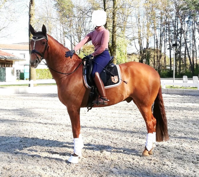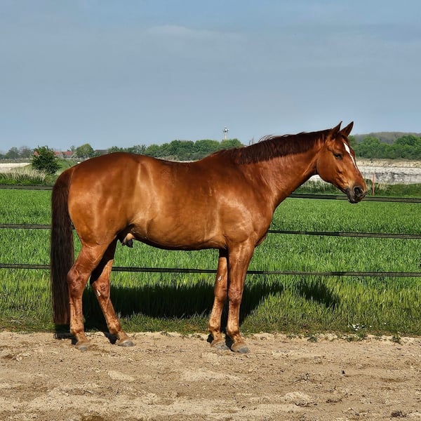 Aus Altersgründen suche ich für meinen selbstgezogenen 9j. Hannoveraner Fuchswallach "Simioni" ein neues Zuhause! Simioni ist ca. 1,71 m groß und wie man sieht, eine stattliche Erscheinung, was bitte nicht zu der Annahme verleiten soll, dass er ein Gewichtsträger ist! Er lebt bei mir quasi im "Familienverbund" mit seiner 10jährigen Halbschwester und seinem 27jährigen Onkel, ist super verträglich und liebt es, zu spielen. Da es mir sehr am Herzen liegt, dass dieses tolle Pferd ausschließlich in allerbeste Hände geht, gebe ich ihn auch nur ab, wenn folgende Kriterien im neuen Zuhause erfüllt werden: 1. KEINE Boxenhaltung, auch nicht mit gepflastertem Mini-Vorgarten (nennt sich gemeinhin Paddockbox), sondern gern Aktivstall in KLEINER Gruppe, Paddocktrail o.ä. 2. Familienanschluß!!! 3. Ausschließlich an gut reitende Freizeitreiterin, keine Turnierreiterin! Da Simioni leichte Stoffwechselprobleme hat, ist Haltung & Fütterung das Maß aller Dinge, um ihn symptomfrei zu erhalten. Er bekommt bei mir Haferflocken, entsprechendes Mineralfutter mit hochdosiert Mangan, Zink, Vit. B und E, KEINE Möhren oder Äpfel, da zu viel Zucker, stattdessen gern Sellerie. Beim Heu achte ich ebenfalls sehr darauf, dass dies einen möglichst geringen Zuckergehalt hat. Hinsichtlich Weidegang ist darauf zu achten, dass ein stoffwechselempfindliches Pferd NICHT den ganzen Tag oder sogar 24/7 in einer fetten Wiese steht, sondern eher "mager" gehalten wird, was nicht heißen soll, dass eine abgefressene ungepflegte Weide zu bevorzugen ist. Wenn man dies beachtet, ist alles in Ordnung. In punkto Reiten sollten solche Pferde möglichst täglich leicht arbeiten. Was ihnen besonders gut tut und auch Spaß macht, sind ausgedehnte Ausritte. Die liebt Simioni auch besonders und er ist super lieb und gechillt. Trotzdem möchte ich darauf hinweisen, dass Simioni KEIN Anfängerpferd ist, sondern schon konsequente Ansagen benötigt. Wer o.g. Kriterien erfüllen kann und will und ernsthaftes Interesse hat, darf sich gern melden. Es handelt sich auch nicht um einen Notverkauf!