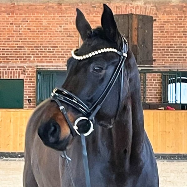 Im Seitenbild von Rubi Rescano zeigt sich seine Eleganz, die durch den angenehm elastischen, schwingenden Bewegungsablauf weitere Unterstützung erfährt. Er wird das Pferd sein, zu dem die Besucher in einer Stallgasse blicken werden. Seine Ausdrucksstärke und Sympathie trägt die klare Handschrift seines Vaters Rubin-Royal. Sportlich steht Rubi Rescano noch voll in der Ausbildung der höheren Lektionen, auch wenn er bereits in M-Dressuren platziert ist. So lassen sich viele Lektionen bereits lässig-leicht abfragen, die fliegenden Wechsel sind aber noch nicht mit der finalen Selbstverständlichkeit abzufragen. Der als nächstes folgende Step in die Klasse S wird noch etwas Ausbildungszeit in Anspruch nehmen. Die Bewegungsmöglichkeiten, um mit entsprechender Ausbildung später regelmäßig in den Platzierungen zu glänzen, hat Rubi Rescano allemal – das zeigt der Blick auf die Verstärkungen in Trab und Galopp. Zudem gibt er dem Reiter ein gutes Gefühl und lässt sich mit feiner Hilfengebung leicht bedienen. Sportname: Rubi Rescano Sporterfolge: DRE (Dressur) Klasse L1 (DRP-L): 1x 1. Platz Klasse L1 (Dre L*): 7x 1. Platz; 1x 2. Platz; 1x 3. Platz; 1x 4. Platz Klasse L2 (Dre L**): 1x 1. Platz Klasse M1 (Dre M*): 1x w DPF (Dressurpferdeprüfung) Klasse A (Dpf A): 2x 1. Platz Klasse L (Dpf L): 1x 2. Platz; 1x 3. Platz; 2x 4. Platz; 1x 5. Platz 2. Generation Sportpferde Dressur: Black Jack 218 v. Boston (NLD) (DRE: Grand Prix mit Tobias Nabben,Dressurprüfung Kl. S*** - Grand Prix Special - 2024,Dressurprüfung Kl. S*** - Grand Prix de Dressage 2024,Dressurprüfung Kl. S*** - Grand Prix Kür - 2024,Dressurprüfung Kl. S*** - Grand Prix de Dressage 2024,Dressurprüfung Kl. S*** - Grand Prix de Dressage 2023,Dressurprüfung Kl. S*** - Grand Prix Kür - 2023,Dressurprüfung Kl. S*** - Grand Prix Kür - 2023,Dressurprüfung Kl. S*** - Grand Prix Special - 2023,Dressurprüfung Kl. S*** - Grand Prix de Dressage 2023,Dressurprüfung Kl. S*** - Grand Prix Kür - 2023); Filia Magica v. Fidertanz (DRE: S* mit Aleksandra Szadkowska); Escada Magica/Escada magica v. Ehrentusch (DRE: M* mit Petra Stroetmann). Aufbauprüfungen Dressur: Fiorello/First Class 82 v. Fidertanz (DRE: L). Bes. Prämientöchter: VbPr Donna-Magica v. Donnerruf. 3. Generation Sportpferde Dressur: gek. Hengst Don Lorean v. Don Larino (DRE: int. Grand Prix mit Yuko Kitai,Grand Prix Kür -international- 2016,Grand Prix -international- 2016,Grand Prix Kür -international- 2016,FEI - Grand Prix (Tour B) 2016,Grand Prix Special -international- 2015,Grand Prix -international- 2015,GP - Grand Prix 2015,Grand Prix Kür -international- 2014,GP Grand Prix 2014,Grand Prix Kür -Weltcup- Qualifikation -international- 2014,Grand Prix Kür -international- 2013,GP - Grand Prix 2010,Dressurprüfung Kl. S*** - Grand Prix de Dressage 2008,Vechta 2007); Desperado 171 v. Dressage Royal (DRE: int. Grand Prix mit Carola Koppelmann,Deutsche Meisterschaft der Dressurreiter GPS 2013,Grand Prix Special -international- 2013,Grand Prix -international- 2013,Dressurprüfung Kl. S*** - Grand Prix de Dressage 2013,Dressurpferdeprüfung -international- WM 6 jährige Kl. M 2009,Dressurpferdeprfg. Kl.L Bundeschampionat 5 jährige 2008,Dressurpferdeprüfung -international- WM 5 jährige Kl.M 2008); Belladonna 36 v. Don Larino (DRE: int. Grand Prix mit Laura Ponnath,Grand Prix Kür -international- 2018,Dressurprüfung Kl. S*** - Grand Prix Special - 2018,Dressurprüfung Kl.S*** mit Piaffe und Passage 2017,Dressurprüfung Kl. S*** - Grand Prix Special - 2017,Dressurprüfung Kl. S*** - Grand Prix Kür - 2017,Dressurprüfung Kl. S*** - Grand Prix de Dressage 2017,Dressurprüfung Kl. S*** - Grand Prix Special - 2017,Grand Prix Kür -international- 2017,Grand Prix -international- 2017,Dressurprüfung Kl. S*** - Grand Prix de Dressage 2016,Dressurprüfung Kl.S*** mit Piaffe und Passage 2016,Dressurprüfung Kl.S*** mit Piaffe und Passage 2016,Dressurprüfung Kl. S*** - Grand Prix Special - 2016,Dressurprüfung Kl. S*** - Grand Prix de Dressage 2016,Dressurprüfung Kl.S*** mit Piaffe und Passage 2016,Dressurprüfung Kl. S*** - Grand Prix de Dressage 2016,Dressurprüfung Kl.S*** mit Piaffe und Passage 2016,Dressurprüfung Kl. S*** - Grand Prix de Dressage 2015,Dressurprüfung Kl. S*** - Grand Prix de Dressage 2015,Dressurprüfung Kl.S*** mit Piaffe und Passage 2015,Dressurprüfung Kl.S*** mit Piaffe und Passage 2015,Dressurprüfung Kl. S*** - Grand Prix de Dressage 2015,Dressurprüfung Kl.S*** mit Piaffe und Passage 2015,Dressurprüfung Kl. S*** - Grand Prix de Dressage 2014,Dressurprüfung Kl. S*** - Grand Prix de Dressage 2014); Dream Box v. Dressage Royal (DRE: Grand Prix mit Dorte Pack,Dressurprüfung Kl.S*** mit Piaffe und Passage 2019,Dressurprüfung Kl.S*** mit Piaffe und Passage 2018); Drip Drop v. Dressage Royal (DRE: int. S** mit Anne Haggenmüller); HORSE24 Dooloop v. Dressage Royal (DRE: S*** mit Juliane Brunkhorst); Romano 79 v. Rosengold (DRE: S** mit Pedro Luiz Almeida Pavao); Finest Flaneur v. Finest (DRE: S* mit Pedro Pavao); Bocca Negra v. Bretton Woods (DRE: S* mit Nicole Kirschnick); Don Gionvanni v. Desperados (DRE: S* mit Hermann Enders); Don Larino 3 v. Don Larino (DRE: S* mit Markus Suchalla); Be Mine Forever v. Zack (DRE: S mit Martina Binnenbrücker); For Me 44 v. Fürstenball (DRE: M** mit Bastian Konzag-Stöbich); Bella Kristina/Bella Amica v. Desperados (DRE: M** mit Marlene Holzrichter); Samouro v. San Amour I (DRE: M** mit Silvia Wiese); Don Diamo v. Don Larino (DRE: M** mit Martin Sander); Knauers Artur v. Aletto (DRE: M** mit Janine Knauer,SPR: 1,30 m mit Janine Knauer); Bella Deluxe 5 v. Don Deluxe (DRE: M* mit Charline Mühle); OLHPrA Balenciaga/Balenciaga 5 v. Vitalis (DRE: M* mit Anja Engelbart); VbPr Bambola/Bambola 4 v. Rouletto (DRE: M* mit Greta Brahms); Don Lucca 2 v. Don Larino (DRE: M* mit Bodo Haase); Liberty Dance v. Liberty M (DRE: M* mit Rena Fraikin). Aufbauprüfungen Dressur: VbPr Bella Secure v. Secret (DRE: M mit Kira Laur