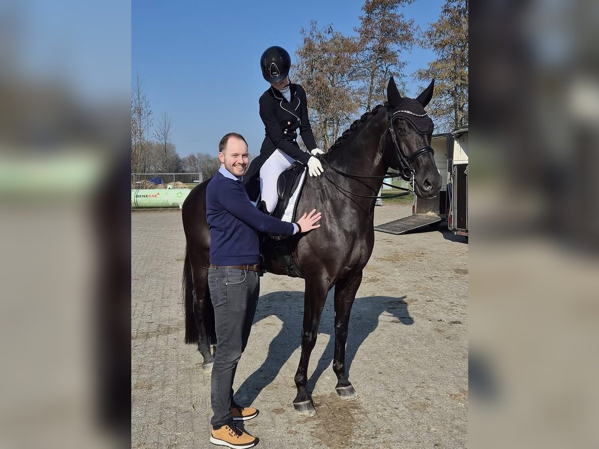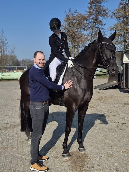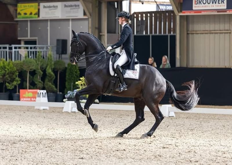 This absolutely stunning black Hanoverian gelding is a true standout for the serious dressage rider seeking quality, presence, and proven potential. Standing at an impressive height with an elegant, uphill build, he embodies the classic Hanoverian type—powerful yet refined, with correct conformation and expressive movement. His striking jet-black coat gleams in all conditions, perfectly complementing his noble head, intelligent eye, and well-set neck that naturally elevates from the withers. He carries himself with balance and cadence, displaying three exceptional gaits. His walk is pure and ground-covering, the trot elastic and expressive with impressive suspension, and the canter uphill, rhythmic, and effortlessly adjustable—ideal for advanced-level work. This gelding has been carefully produced with a focus on correct training and long-term development. He is confidently schooling advanced dressage movements, demonstrating talent for collection, engagement, and lateral work. His rideability is one of his strongest attributes—responsive, willing, and always eager to please, making him a rewarding partner for a skilled rider aiming for higher-level competition. In addition to his athletic ability, he has an outstanding temperament. He is sensible, focused, and reliable in both training and competition environments. He thrives on a consistent program and forms a strong partnership with his rider. Well-trained show jumper with virtually unlimited scope, a very good overview and an athletic attitude. He is for any ambitious rider wanting to be successful in the highest levels of show jumping. Importantly, he comes with recent, comprehensive veterinary reports, including clean X-rays, giving full confidence in his soundness and future longevity in sport. He has been well cared for, with no known health issues, and is up to date on all vaccinations and maintenance. This is a rare opportunity to acquire a top-quality Hanoverian gelding with the talent, training, and temperament to excel at advanced dressage levels.
