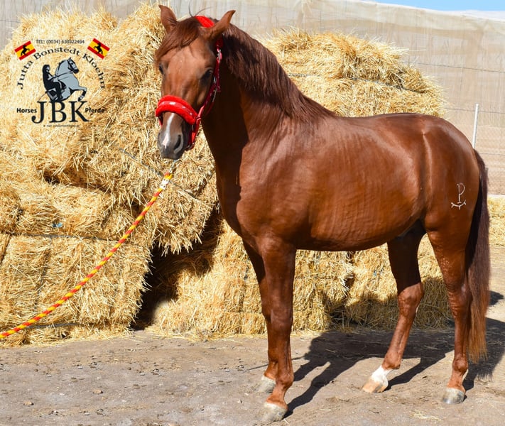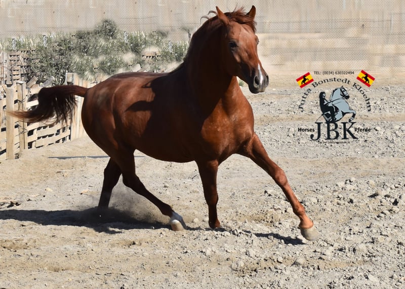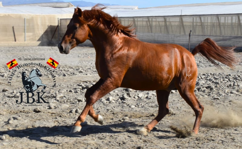 Hispano Árabe POTOSI busca un nuevo hogar Este espléndido semental Hispano Árabe de pura raza es un ejemplar magnífico de su raza. Se mueve con mucho espíritu y elegancia, siendo muy ágil y expresivo. Puedo imaginarme a Potosi bien en la Equitación de Trabajo en el futuro. Bajo el sol andaluz, su pelaje brilla como el fuego. Un caballo de ensueño que además es muy cariñoso. Creció en un grupo en la yeguada de su hogar. Allí sigue siendo su hogar, nunca ha experimentado nada malo en su vida y fue criado de manera adecuada, con alimentación suplementaria de minerales y desparasitaciones, como se debe. Quien desee formar a un tesoro así por sí mismo: aquí está, el Potosi. Nacido el 09.02.2022, mide 1,58 m actualmente.