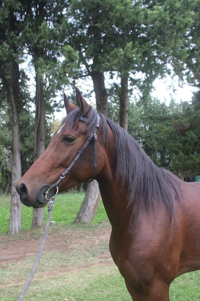 Hispano-Araber ONC, geboren in einem Zuchtbetrieb. 6 Jahre alt. 1,54 m. Sehr lieb, äußerst menschenbezogen. Einfach im Umgang, liebt es, gepflegt zu werden. Sehr anhänglich. Im Training auf der Karrierebahn und auch im Gelände unterwegs. Keine Macken.