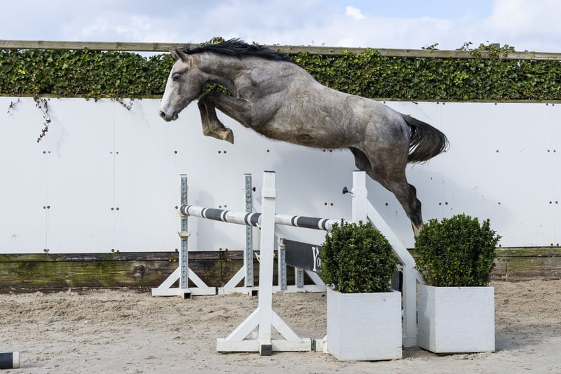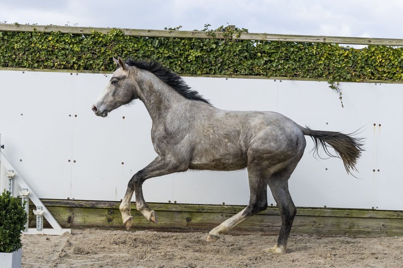 Zuperstar is a grey horse that immediately radiates scope. He has a very strong model and jumps with a lot of push-off and a good way of jumping. He seems to have natural scope and shows this with great ease. He moves very well, has a good trot and an excellent canter. What stands out is that for his young age he already shows a lot of balance in everything he does. A horse that presents himself easily and shows a lot of quality. In our opinion a very interesting horse for the future. Sire Zirocco Blue VDL competed at 1.60m Grand Prix level and is one of the leading sires, with offspring performing worldwide at the highest level up to 1.70m. Dam M-Quick and Fly W is a daughter of Quabri de l’Isle (1.70m) and again brings proven top sport genes into the line. The damline is well built with several horses at level: Upton – 1.50m Leonello – 1.40m Beautyful Nizza – 1.30m A family with modern sport genes and performance focus.
