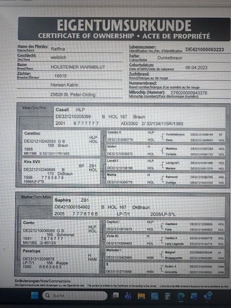 Traum-Offerte für den Springsport: Casall x Cento – Leistung pur bei bestem Charakter! Zum Verkauf steht eine bildschöne, 3-jährige Holsteiner Stute, die keine Wünsche offen lässt. Diese junge Dame besticht nicht nur durch ihre auffällige, edle Aufmachung, sondern vor allem durch ihre erstklassige Abstammung und ihren einwandfreien Charakter. Vater: Der Ausnahmehengst Casall spricht für sich und steht weltweit für absolute sportliche Höchstleistung und Rittigkeit. Mutter: Ein echtes Leistungsmodell! Mit über 300 Starts und 196 Platzierungen bis zur Klasse S** ist sie hoch erfolgreich im Sport gewesen. Zu ihren Highlights zählen die Teilnahme am Bundeschampionat sowie an der Weltmeisterschaft der jungen Pferde. Die Stute ist ihrem Alter entsprechend solide ausgebildet und bereits schonend angeritten. Sie zeigt sich in der täglichen Arbeit absolut unkompliziert, lernwillig und extrem menschenbezogen. Dank ihrer Übersicht und ihrer braven Art ist sie bereits jetzt eine Empfehlung für ambitionierte Amateure, Umsteiger oder Reiter, die sich ihr Nachwuchspferd für den großen Sport selbst weiter ausbilden möchten. Eigenschaften auf einen Blick: Charakter: Absolut artig, schmiedefromm und unkompliziert im Handling. Eignung: Springen , Vielseitigkeit, gehobener Freizeitsport. Direkt startbereit für die weitere Förderung. Diese Stute ist eine Gelegenheit für alle, die Qualität aus abgesichertem Leistungsstamm suchen.