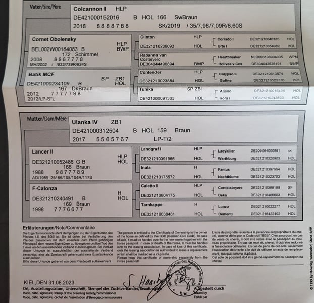 Z wielkim żalem sprzedajemy naszą 5-letnią klacz holsztyńską „Lilly“. Lilly jest moją własnością od trzech lat i została zakupiona bezpośrednio od hodowcy w Szlezwiku-Holsztynie. Rok temu została delikatnie wytrenowana do jazdy. Zarówno w ujeżdżeniu, jak i w terenie, pokazuje się z najlepszej strony. Lilly jeszcze nie jest „skoczką zawodową”, ale również w skokach zawsze była bardzo spokojna i posłuszna. Uważam Lilly za bardzo uważnego konia, który jest jednocześnie bardzo posłuszny i sprawia mi dużo radości. Mogłabym ją również wyobrazić sobie jako „koń rodzinny”. Latem i zimą Lilly przebywa w grupie czterech klaczy. W lecie ma dostęp do pastwiska 24/7, zimą nocuje w boksie, a w ciągu dnia na padoku. Lilly sprzedajemy tylko dlatego, że z powodu powiększenia rodziny nie mogę już poświęcać jej tyle czasu, ile bym chciała. Sprzedajemy ją wyłącznie w najlepsze ręce. Płeć: klacz Wzrost: ok. 163 cm Rok urodzenia: 05/2021 Kolor: brązowy Rasa: holsztyńska Dodatkowe cechy: wszechstronny koń, jeżdżony, prowadzone na halterze, lonżowany, z paszportem koniowatych Rodowód na ostatnim zdjęciu W razie dodatkowych pytań, proszę o kontakt.