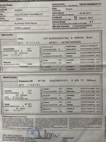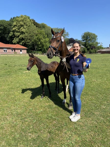 Hello, for sale is my eight-year-old mare "Count Me In". She is by Uriko x Cormint. The mare is very well-behaved and uncomplicated in handling. She is very sweet with everything you need to do in everyday life with the horse. I bought her when she was six years old (she had a foal with her previous owner) and backed her without any problems. She was trained up to A level in jumping, but due to my profession, I no longer had the time to further develop her, which is why she was bred to Charthago Blue OLD (Klatte Stud) in 2024. She gave birth to a healthy colt at our home without complications—I was present. On June 21, 2025, the little colt was awarded at Klatte Stud; the entire presentation can be found on Clip My Horse (Cayman Blue SW). The mare is only being sold because I would like to breed ponies, as that fits better with our facility. If you have any further questions, feel free to send a message!