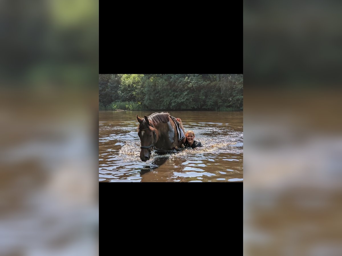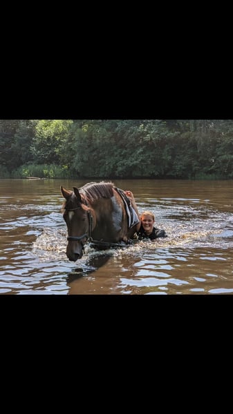 Kaija verfügt über überdurchschnittliche Bewegungen und zeigt sich talentiert am Sprung. In jungen Jahren wurde sie für den Turniersport ausgebildet, woran sie jedoch keine Freude hatte. Im Wald, bei Ausflügen zum Strand oder anderen lustigen Events stand sie uns aber immer begeistert zur Seite. 2024 war sie beim Hengst und hat uns 2025 ein schönes Hengstfohlen geschenkt. Anfang diesen Jahres haben wir sie langsam wieder unter den Sattel genommen. Momentan reiten wir sie nur locker und machen kleine Hüpfer mit ihr. Kaija hat einen eigenen Kopf und ist kein Anfängerpferd. Sie braucht einen Reiter, der ihr Sicherheit gibt und nicht böse wird, wenn sie mal "einen Knoten im Kopf" hat. Ich wünsche mir für sie, dass sie in liebevolle Hände kommt, zu einem Reiter ohne große Turnierambitionen.