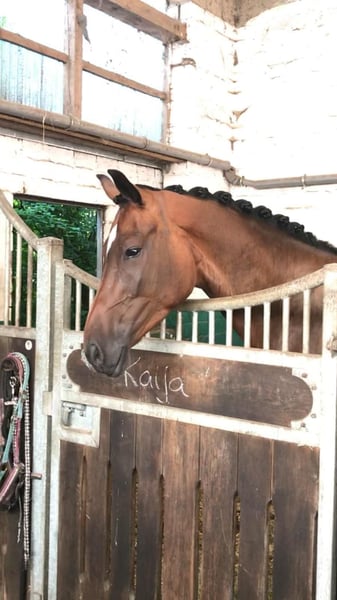 Kaija possiede movimenti sopra la media e si mostra talentuosa nel salto. Da giovane è stata addestrata per il salto sportivo, ma non ha mai trovato entusiasmo in questa disciplina. In compenso, ci ha sempre accompagnato con entusiasmo in passeggiate nel bosco, alle escursioni in spiaggia o ad altri eventi divertenti. Nel 2024 è stata coperta da un stallone e nel 2025 ci ha regalato un bellissimo puledro stallone. All'inizio di quest'anno l'abbiamo gradualmente rimessa sotto sella. Al momento la montiamo solo in modo rilassato e facciamo piccoli salti con lei. Kaija ha un carattere deciso ed è inadatta ai principianti. Ha bisogno di un cavaliere che le dia sicurezza e che non si arrabbi se a volte "ha la testa vuota". Desidero per lei che trovi una famiglia affettuosa, con un cavaliere senza grandi ambizioni da competizione.