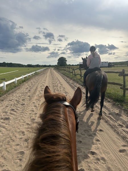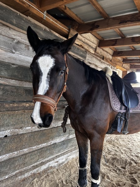 Schweren Herzens müssen wir uns von unserer hübschen Holsteinerstute Ivy trennen. Sie ist 1.68m groß und wurde 2017 geboren. Sie hat, wenn man ihr Vertrauen gewonnen hat, einen wunderschönen Charakter mit dem man alles machen kann. Im Gelände ist sie super zuverlässig und rennt nicht los, wenn sie sich mal erschreckt. Sie ist ein gezogenes Springpferd und hat dabei grundsätzlich super viel Spaß. 2025 hat sie leider Rehe bekommen, weshalb sie eine Pause gemacht hat. Die Rehe hat sie super verkraftet, ihr Hufbein ist auch nicht rotiert. Leider wissen wir nicht, woher sie die Rehe bekommen hat und aus diesem Grund steht sie bei uns nun in der Box, da wir vermuten, dass es irgend etwas mit unserem Paddock vom Offenstall zu tun hat. Außerdem hat sie einen alten Fesselträgerschaden im Hinterbein. Dieser schränkt sie jedoch nicht ein, wir sind mit ihr auch noch gesprungen, wobei sie mit viel Spaß alles gegeben hat. Sie wurde schonend wieder antrainiert und ist jetzt wieder voll dabei. In der Dressur arbeiten wir gerade an der ordentlichen Anlehnung. Sie lernt sehr schnell und wir sind auf einem sehr guten Weg. Für die Zucht wäre sie auch interessant, wenn da Interesse besteht, melden sie sich gerne. Röntgenbilder sind vorhanden Falls sie sich in unsere hübsche Stute verliebt haben, würde sie sich über einen Besuch in Phöben freuen. :) Wir geben sie inklusive vollständigem Zubehör ab :) Reitvideos sind vorhanden.