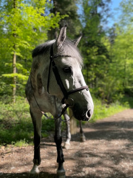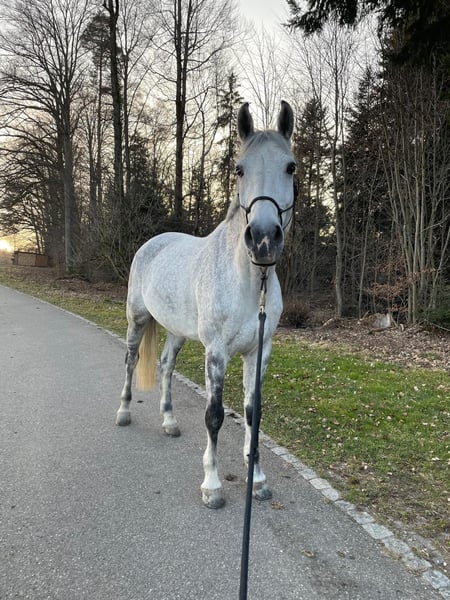 Im Auftrag: Holsteiner / 12j. / Schimmel / 1.70 Aufgrund Zeitmangels sucht dieser hübsche Schimmelwallach ein neues Zuhause. Er ist in allen drei Grundgangarten sehr einfach und unkompliziert zu reiten. Sehr bemüht seinem Reiter zu gefallen, verfügt er über eine gute Dressur- und Springausbildung und kennt da seinen Job als Lehrmeister genau. Im Gelände ist er DIE Lebensversicherung. Ob zu zweit oder allein, überdurchschnittlich brav und verkehrssicher. Charakterlich und im Umgang sehr ausgeglichen, freundlich zum Menschen und seinen Artgenossen, findet man auch da nur lobende Worte für ihn. Aufgrund seines angenehmen Temperaments ist er absolut auch für schwächere Reiter oder Wiedereinsteiger geeignet. Wir suchen für ihn einen Platz als liebevoller Freizeitpartner, wo man ihn und seinen gutmütigen Charakter schätzt und ihn vielseitig beschäftigt. Rundum ein Kumpeltyp, der einem täglich ein Lächeln ins Gesicht zaubert. Preis: 18'000.- VHB. Inkl. komplettem Equipment. Das richtige Zuhause hat Priorität. Fotos und Videos, von denen es mehr als genug gibt, können via +41 78 644 29 26 angefragt werden Probereiten gegen eine Gebühr von 50.- selbstverständlich möglich.