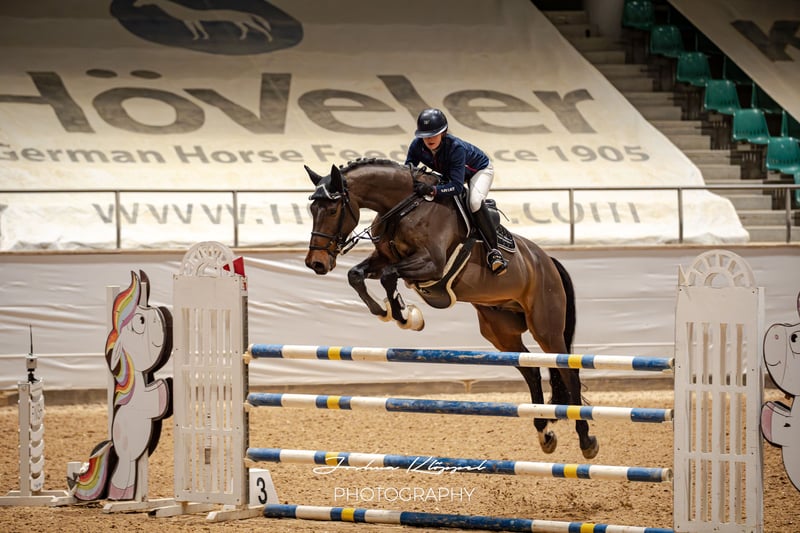 Un deportista bien colocado, con un talento enorme y un corazón de oro, listo para montar de inmediato. "Connor Deluxe H" — su nombre no promete demasiado — aquí se ofrece un caballo de ensueño absolutamente experimentado. Este elegante, alto y largo semental con una base sólida se mueve bien en las tres aires básicas, con elasticidad y volumen, especialmente en el galope. "Conny" es de movimientos suaves y cuenta con un temperamento ideal; su tamaño apenas se nota. Suficientemente enérgico, pero siempre calmado. En el trabajo de doma, es fácil de montar, incluso para amateurs, damas y jinetes jóvenes. En los saltos, sabe sorprender: además de un talento ilimitado, posee una técnica muy buena y una cautela marcada — siempre con buen basculamiento, ligero y con excelentes reflejos. En el manejo, es absolutamente tranquilo en todas las situaciones — Conny "está en paz consigo mismo". Corte, herrado, transporte, paseos, etc. — ¡no hay caballo más fácil de manejar! Busca un hogar 5* donde sus cualidades sean valoradas. También es muy apto para su uso en la disciplina de Equitación. Ha estado en la misma mano desde su potro, solo se vende por motivos de cría. Conny está sano y en excelente forma, cuenta con un informe radiológico actual. Clasificado para 2025 hasta 1,35 m, en perfectas condiciones para montar de inmediato y listo para 2026.