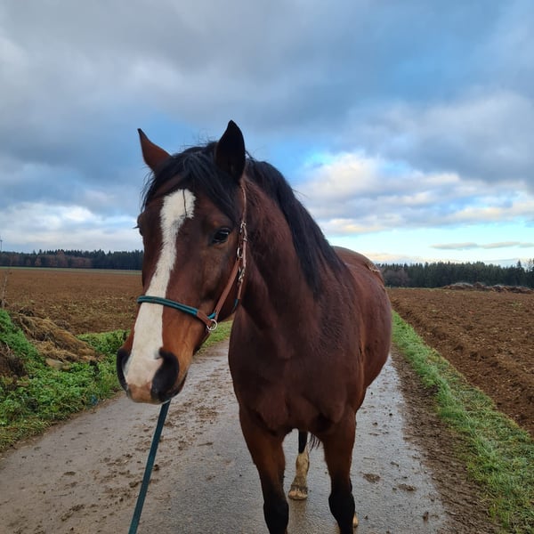 Ich biete zunächst nur eine Pflegebeteiligung (kostenlos) oder Reitbeteiligung (70€) die sich ihn erst wieder antrainieren muss ( in dieser Zeit kostenlos) an meinem Wallach etwas nördlich von Schwäbisch Gmünd an. Eine kleine Halle, ein wetterabhängiger Platz und schönes Ausreitgelände vorhanden. Nach Absprache 2-4x wöchentlich. Keine Turnierteilnahme möglich. Cardhu ist ein Holsteiner Wallach, 2013 geboren, Barhufer und 1,70m. Es ist ein frecher, meinungsstarker und aufgeschlossener Wallach der Aufmerksamkeit sucht und gefallen möchte. Sollte er sich ungerecht behandelt fühlen oder keine ausreichende Führung bekommen, so zeigt er dies auch und wird stur. Er reagiert aber sehr gut auf Vertrauens- und Bodenarbeit. Da mir berufsbedingt bisher die Zeit fehlte, wir er nur 2-3x die Woche mit der bereits bestehenden Pflegebeteiligung (Mittwoch, Donnerstag und Samstag momentan vergeben) bewegt, genießt seine Herde und geht ansonsten mit mir ab und zu spazieren. Durch meinen neuen Job wird das zukünftig aber besser. Er braucht eine geduldige, einfühsame und sehr konsequente Person an seiner Seite, die deutlich aber weder zu grob noch ungerecht sein sollte. Er freut sich über neue Aufgaben und ist in der Regel motiviert dabei, kann sich aber nicht so ewig konzentrieren. Er ist aufgrund seines Charakters und Ausbildungsstandes (wenig geritten und etwas im Gelände unterwegs gewesen. Seit 3 Jahren wg. MIM (früher pssm2) und meiner fehlender Zeit nicht mehr unter dem Sattel und daher kein Kinder- und/oder Anfängerpferd! Falls eine Reitbeteiligung (max. 85kg) gewünscht ist, solltest du eine weiche Hand und einen ausbalancierten Sitz haben. Es besteht Helmpflicht! Reitunterricht zumindest anfänglich gerne gesehen. Du solltest 100% zuverlässig, einfühlsam, wetter- und sattelfest sein. Volljährigkeit und Verantwortungsbewusstsein setze ich bei Cardhu voraus. Da die Busverbindung in Utzstetten übersichtlich ist, solltest du mobil sein. Wenn alles passt, arbeitest du selbständig mit dem Pferd. Die Reitweise wäre offen, egal ob englisch oder Western. Ich selber weiß noch nicht ob ich aufgrund meiner gesundheitlichen Problemen nochmal reiten kann und werde. Cardhu kommt weder mit meinem Gewicht, noch mit meiner körperlichen Schiefe gut klar. Du suchst eine langfristige Beteiligung, ein Pferd wie fast das Eigene? Die Beschreibung hört sich für dich passend an? Du hast Fragen? Wir freuen uns auf eine Nachricht. Keine Sorge, ich helfe natürlich gerne und stehe für alle Fragen jederzeit bereit damit ihr ein gutes Team werdet/bleibt. Auf dem Hof sind viele Pferde, verteilt in verschiedenen Herden. Wir sind reitweisenübergreifend freundlich zueinander. Daher sollte einer aufgeschlossenen Person der Anschluss nicht schwer fallen.