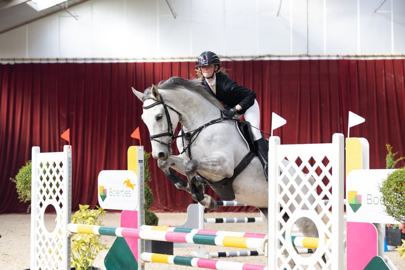 This mare has been competing this winter and is doing great with our 17-year-old intern. They are currently jumping at 110 cm. She is very easy to ride and brings a lot of joy to our rider. She jumps superbly!