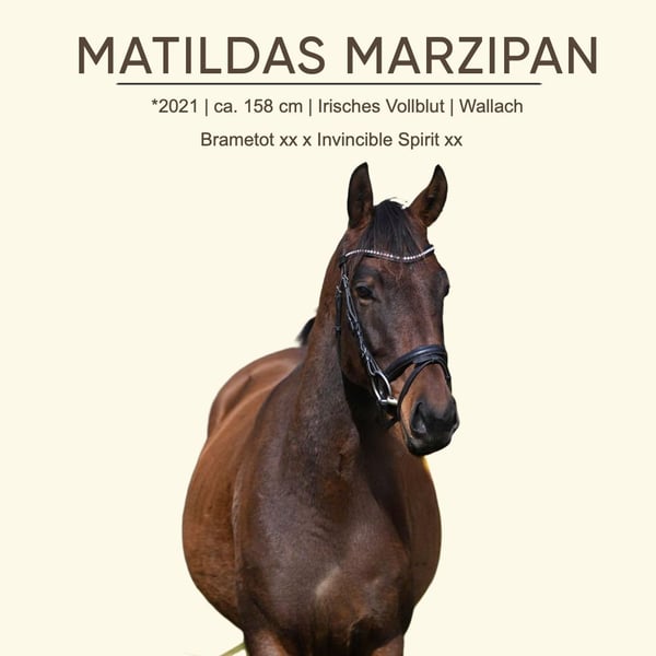 MATILDAS MARZIPAN präsentiert sich trotz seines jungen Alters schon sehr brav und kopfklar. Bereits bei den ersten Reitversuchen zeigt sich der schicke Wallach außergewöhnlich kooperativ und ausgeglichen. Ganz selbstverständlich macht er stets mit, ohne auch nur an eine Unart zu denken – immer bemüht, alles richtig zu machen. Mit seiner freundlichen Art, seiner Gelassenheit und seiner positiven Ausstrahlung präsentiert er sich durchweg von seiner besten Seite und lässt auf eine schöne sportliche Zukunft hoffen. Hier reift ein Juwel von besonderer Güte heran!