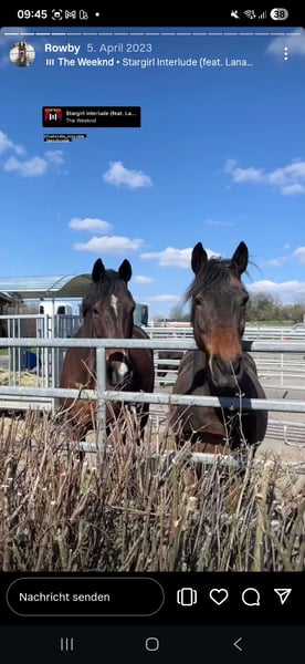 Nuestro Rowby tuvo que terminar su carrera en la escuela de doma debido a que, tras una operación de tendones y tratamiento con ondas de choque, ya no soporta cargas. Es sociable, completamente sano, lleva herraduras en las delanteras, y está vacunado y desparasitato de manera natural. Rowby necesita a su humano y espacio suficiente. Se puede dar paseos a caballo.
