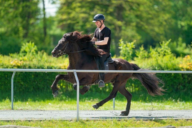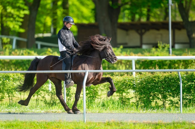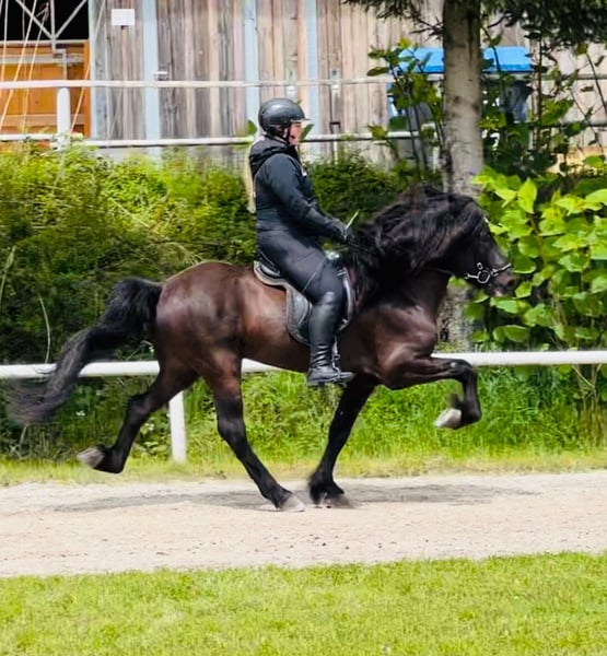 Kanslari frá Hófi Gelding, 1.50 m *Born in 2016 in Iceland Four-gaited Black with a star Immunized, vaccinated, and dewormed FIZO approved (8.29 without passport) BLUP 111 (114 without passport) Sire: Ölnir frá Akranesi 8.82 (Ext. 8.43, Re. 9.09‼️) Dam: Glotti frá Sveinatungu 8.64 (Ext. 8.24, Re. 8.90‼️) Granddam: Kantata frá Hofi 8.26 (Ext. 8.44, Re. 8.14) Great-granddam: Kormákur frá Flugumýri 8.30 (Ext. 8.23, Re. 8.37) Kanslari combines everything! Excellent gait quality, outstanding appearance (9.5 for mane and tail), and a dream character. His mother, Kantata, is also the dam of the magnificent Konsert frá Hofi, Kvarði frá Hofi, and Kunningi frá Hofi, with none of her offspring leaving anything to be desired. His sire is none other than Ölnir frá Akranesi, known for consistently producing top-quality progeny that impress with both appearance and gait. We had the opportunity to train offspring of Ölnir in Iceland. It was incredible—super friendly, uncomplicated, with fantastic gaits, and all with a special look. It was clear then: we wanted a child of Ölnir, and here he was… our handsome Kanslari. He was presented at FIZO and scored 8.44 for conformation and 8.21 for riding qualities as a four-gaited horse. His gaits are evenly well-developed, and his tölt, rated 8.5, is always rhythmical with a high, clear movement. Kanslari is an impressive 1.50 m tall stallion with an excellent character that you can always rely on – guaranteed fun factor included. He impresses with his joy of tölting in the terrain and remains motivated and eager to work in the arena, hall, and on the oval track. A reliable dream horse that convinces with willingness to perform and positive charisma, whether as a luxury leisure horse or breeding stallion. Due to a mild eczema, he is offered at a very fair price. Anyone interested in getting to know and try this beauty is welcome to arrange a visit with us in A-5221 Lochen am See.