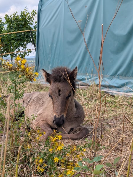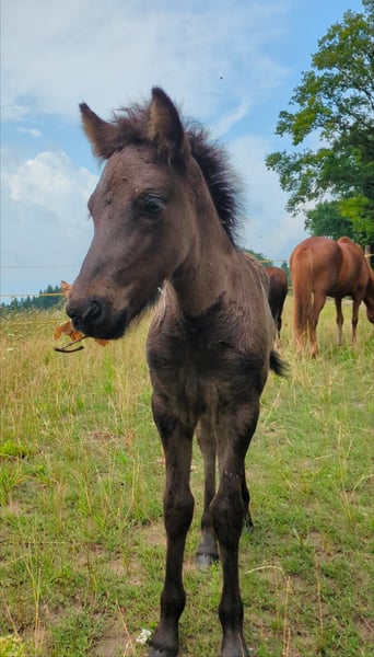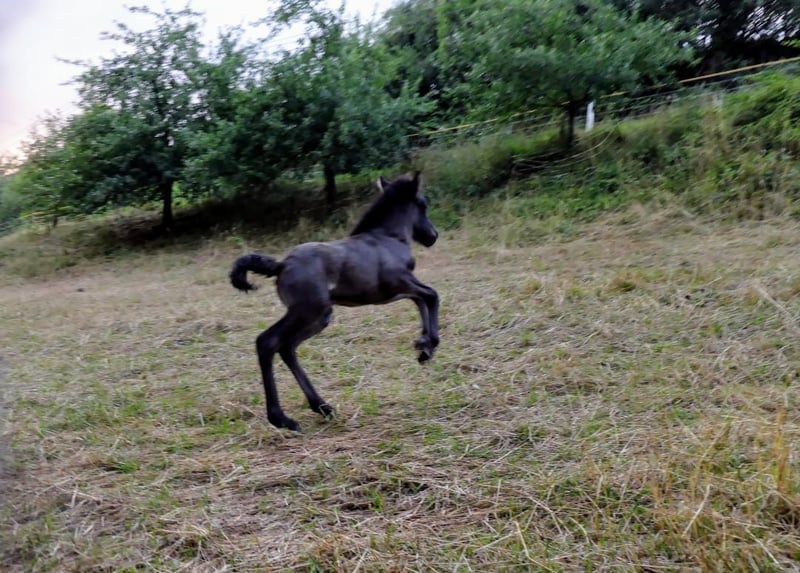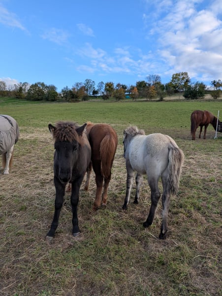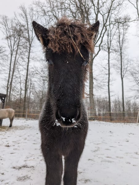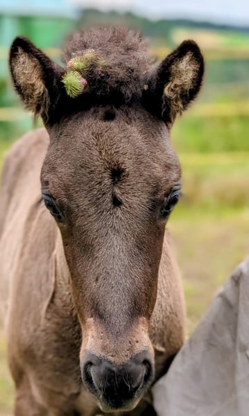 Kjartan vom Krähenfels ist ein sehr großes und gut entwickeltes Hengstfohlen, geboren am 06.07.2025. Er ist ein zuckersüßer, witziger Kerl, der sicher viel Behang bekommen wird. Er wächst artgerecht im Herdenverband auf und wurde regelmäßig entwurmt und ausgeschnitten. Er kennt das Fohlen ABC und ist dabei sehr neugierig, aufgeschlossen und dem Menschen zugewandt. Er ist unerschrocken und für jeden Spaß zu haben. Er vereint beste Reitpferdegene in seinem Pedigree. Seine Mutter ist ein absolutes Luxus-Reitpferd mit klar getrennten, bequemen und taktklaren fünf Gängen und sehr gutem Temperament. Sein Vater war 2024 mit einer Endnote von 8,20 Körungssieger in Baden-Württemberg und wird sicher noch von sich hören lassen. Er stellte 2025 das Siegerfohlen (Endnote 8,30) der Fohlenreise in Baden-Württemberg. Die beiden Brüder von Kjartan (6 und 7 Jahre alt) sind beide über 1,40 m, zeigten sich in der Ausbildung sehr unkompliziert und sind beide im Freizeitbereich, auch mit Kindern im Einsatz . Sie überzeugen beide mit sehr schönen Gängen und angenehmen Interieur. So wie Kjarten sich bis jetzt zeigt, wird er sicher in ihre Fußstapfen treten. Kjartan wurde bei der Fohlenprüfung vorgestellt und erhielt folgende Bewertung: Exterieur: 8,10 Interieur: 8,00 Gänge: 7,80 Richterspruch: "Mutiges, selbstbewusstes Fohlen mit viel Tölt, gut mittleren Bewegungen, mittlerer Tempofähigkeit und viel Freude am Laufen". Kjartan kann jetzt abgesetzt werden und ins neue Zuhause umziehen oder zur weiteren Aufzucht auf Krähenfels bleiben. Nur in allerbeste Hände. Platz vor Preis.