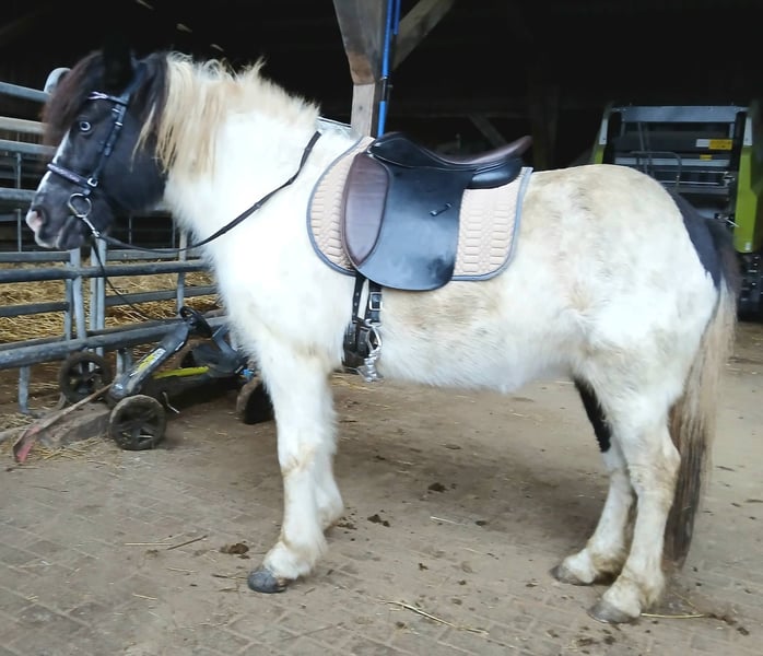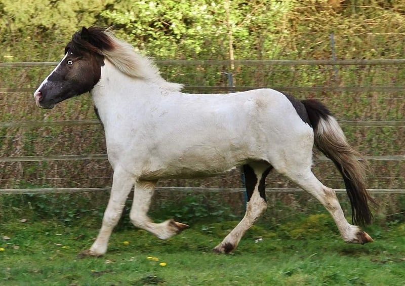 Genesis sucht ihren Menschen der sie weiter ausbildet und trainiert oder auch Zuchtinteresse hat. Genesis wurde letztes Jahr angeritten, stand zwischendurch wegen Zeitmangel mit längerer Pause auf der Weide und wird seit kurzem wieder geritten. Davor war sie in der Zucht, überzeugte mit guter Nachzucht und ist selbst Stutbuch 1 eingetragen mit 7,9 für Gang und Exterieur. Dadurch ist sie reiterlich noch sehr wenig genutzt und auch von der Zucht nicht ausgeleiert, da sie ein gutes Bindegewebe mitbringt. Aktuell ist sie etwas zu dick durch die lange Standpause. das Gewicht sollte mit kontinuierlichem Training sich aber wieder bessern, zumal sie mittlerweile schon etwas mehr Figur durchs Reiten bekommen hat. Genesis ist Fünfgänger, sie zeigt Freilaufend überwiegend ihre gut und sicher mit viel Raumgriff und schönen Bewegungen ausgeprägten Grundgänge. Zeitweilig auch Tölt. Unter dem Sattel hat sie einen immer taktklaren Schritt und auch der Trab ist in der Regel gut abrufbar. Auch Wechsel zwischen Tölt und Trab lassen sich sehr einfach mit wenig Hilfen reiten. Mittlerweile ist sie schon sehr einfach anzutölten benötigt aber im Tölt noch etwas Unterstützung und Training um diesen auf längeren Strecken taktrein zu halten. Man merkt deutlich wenn sie ermüdet da sie dann von sich aus versucht den Trab zu wählen. Daher wird sie normalerweise derzeit nur kurze Strecken mit Pause getöltet um erstmal Muskulatur und Ausdauer aufzubauen. Derzeit arbeite ich sie nicht im Galopp da ihre Kondition dazu noch nicht langt, auf ebener Strecke schafft sie den Galopp mit Reiter noch nicht und kann dann in Pass oder Kreuzgalopp fallen. Bergauf hat sie es deutlich einfacher den Takt im Galopp zu halten, lässt sich da auch gut anschieben und springt dann auch sehr schön den Galopp. Mit mehr Training und Gymnastizierung gehe ich davon aus das sie den Galopp auf ebener Strecke auch irgendwann sehr gut unter dem Reiter meistern wird. Sie kennt die Hilfen zum Pass legen noch nicht, als sie mir einmal in den Pass gefallen ist konnte ich sie darin aber Problemlos beschleunigen so das es deutlich war das sie auch darin sicher nicht untalentiert ist, ihr aber derzeit da auch einfach noch die Kraft und Kondition fehlt. In der Regel reagiert sie fein auf Hilfen ohne sensibel zu sein, zum Anreiten, Antraben und Antölten langt meist schon die Stimmhilfe. Auch reagiert sie normal immer direkt auf die Hilfen zum langsamer oder stehen bleiben, da ich sehr großen Wert darauf lege das ein Pferd eine Bremse hat. Genesis kann ein etwas spritziges Temperament haben und ist deswegen und auch wegen ihres Ausbildungsstandes derzeit nur für erfahrene selbstsichere Reiter geeignet die sie noch weiter Ausbilden und Fördern möchten. Zurzeit wird sie alleine ins Gelände geritten. Genesis ist 2013 bei mir geboren, seither gesund, Ekzemfrei, geimpft und regelmäßig Entwurmt. Sie deckt mich sehr gut ab auch wenn sie selbst nur ein mittleres Maß hat, durch ihr kompakt harmonisches Gebäude, ihre Ausstrahlung und Aufrichtung wirkt sie unter dem Reiter größer. Sie bringt stabile Beine und ein eher quadratisches Gebäude und ein gut angesetzter Hals mit, dadurch trägt sie ohne Probleme einen Erwachsenen bis 75 kg. Genesis lässt auch bezüglich Abstammung keine Wünsche offen, als Enkelin des berühmten Glampi frá Vatnsleysu. Zusätzlich finden sich noch Adam frá Ásmundarstöðum und Hrafn frá Holtsmúla in ihrer Abstammung. Genesis selbst ist eine sehr hübsche Scheckstute mit Blesse und einem braunen Menschenauge und einem blauen Auge. Genetisch bestätigt ist das sie reinerbig Schwarz ist d.h. bei Zuchteinsatz kann sie niemals ein fuchsfarbbasiertes Fohlen bekommen. Durch ihren Helmscheckvater hat sie auch sicher noch das Splash-Gen geerbt und kann daher jeweils zu 50 % noch das Splash-Gen wie auch das Tobiano-Gen vererben. Gerne kann sie von einem erfahrenen Reiter Probegeritten werden und wenn alles passt auch zeitnah in ein neues Zuhause umziehen. Das Video ist ganz aktuell. Fotos ihrer Nachkommen als letztes in der Bildergalerie. Eine Aku kann gerne vom Käufer veranlasst werden. Bei echtem Interesse freue ich mich auf Nachricht. Aufgrund von schlechten Erfahrungen kein Verkauf in die Schweiz.